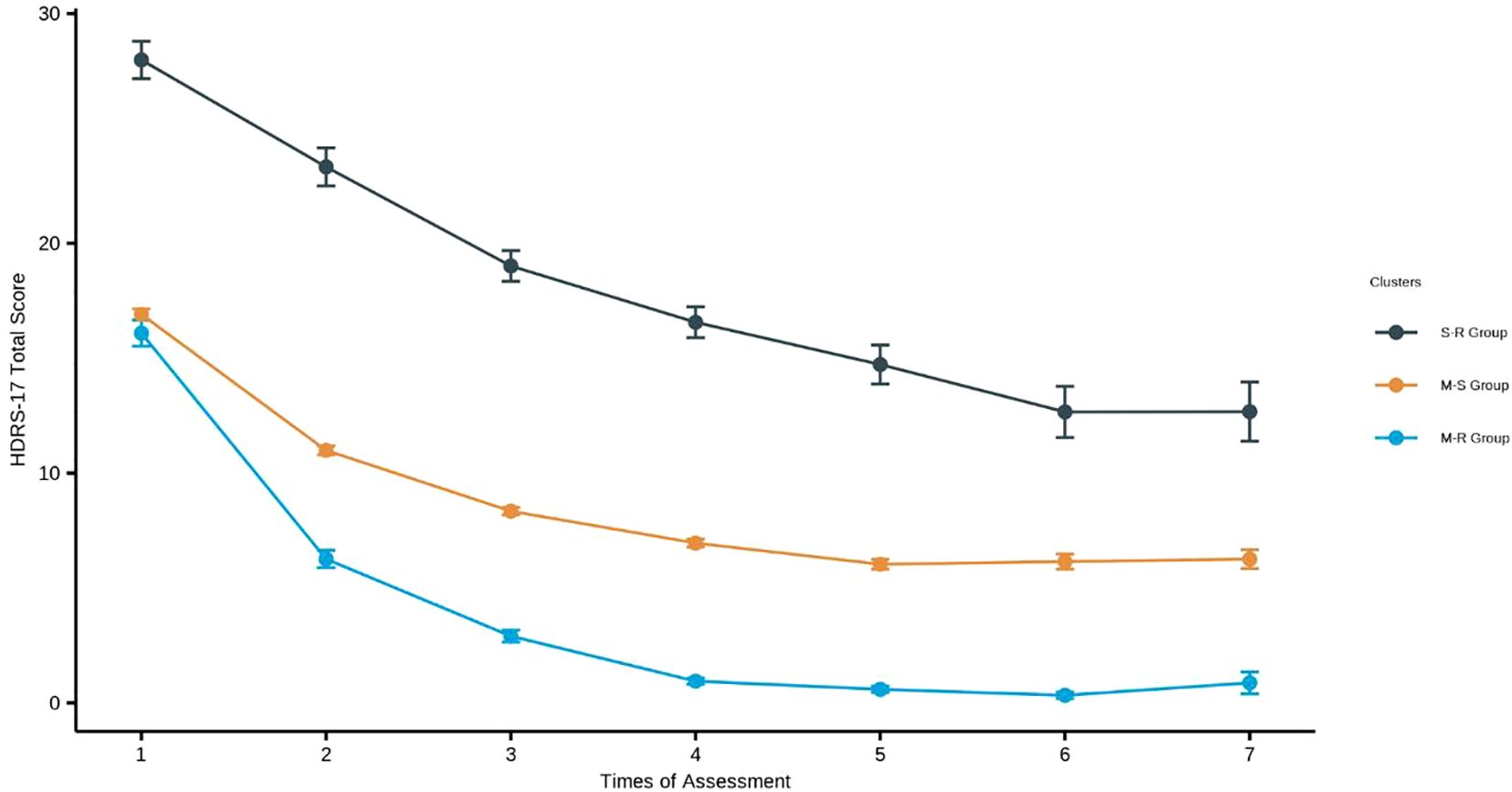 Line graph showing HDRS-17 total scores over seven assessments for three groups: S-R, M-S, and M-R. S-R group decreases from 28 to 16, M-S from 14 to 12, and M-R from 12 to 6. Error bars indicate variability.