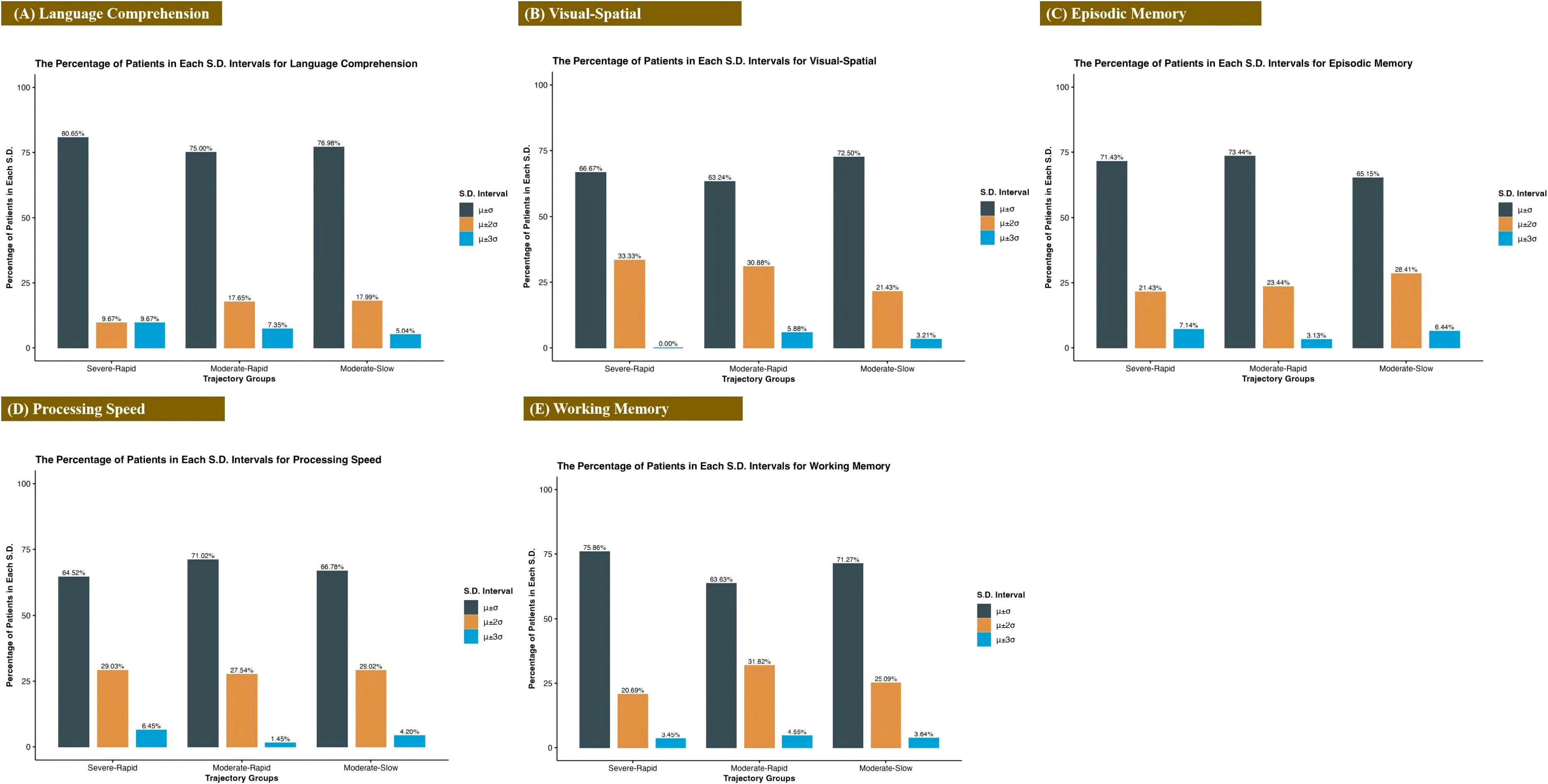 Five bar graphs illustrate the percentage of patients in three trajectory groups—Severe-Rapid, Moderate-Rapid, and Moderate-Slow—for different cognitive domains: Language Comprehension, Visual-Spatial, Episodic Memory, Processing Speed, and Working Memory. Each graph displays data in three standard deviation intervals: µ±0σ, µ±2σ, and µ±3σ. Most patients fall within µ±0σ across all domains. Notably, Language Comprehension and Working Memory show higher percentages in the Severe-Rapid group, while Visual-Spatial and Episodic Memory have increased percentages in Moderate-Trajectories and lower intervals.