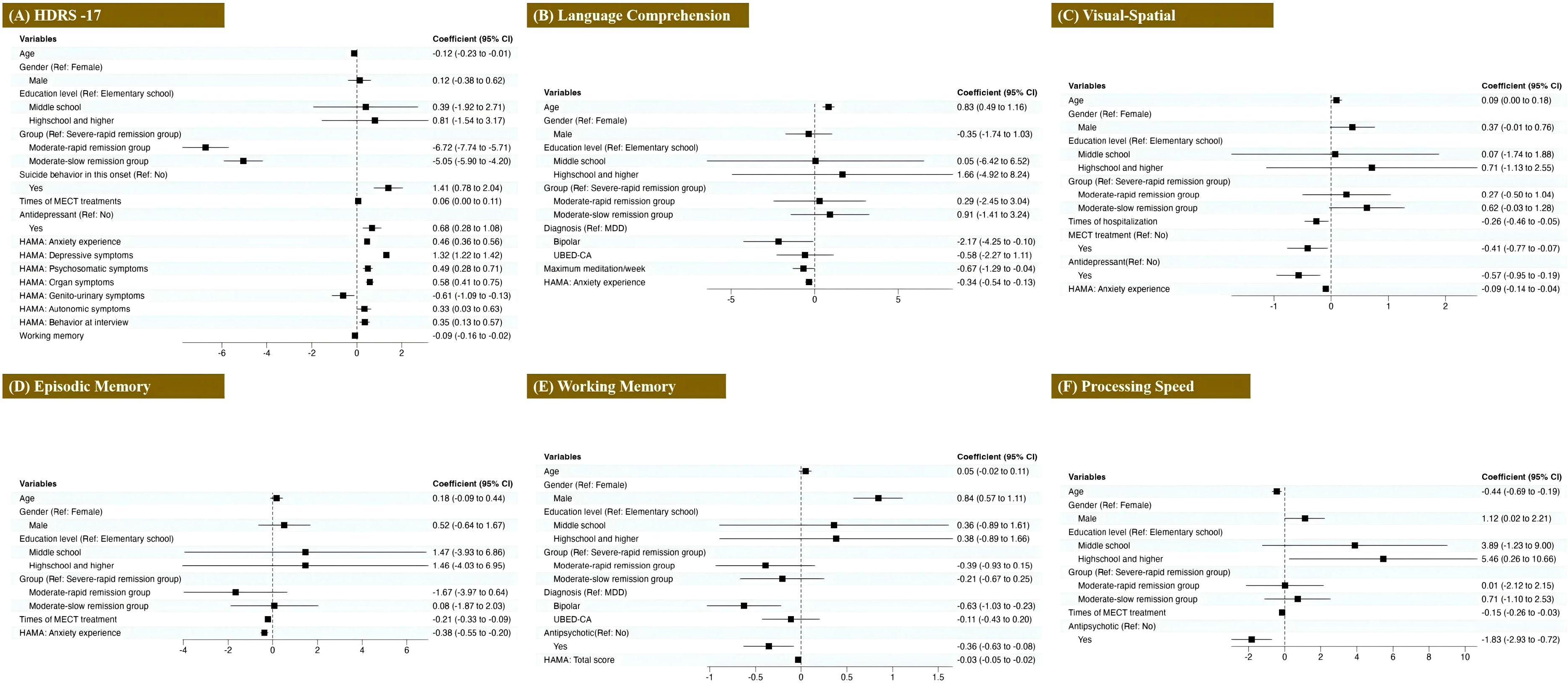 Six-panel graphical chart displaying coefficients with confidence intervals for various cognitive measures. Panels include: (A) HDRS-17, (B) Language Comprehension, (C) Visual-Spatial, (D) Episodic Memory, (E) Working Memory, and (F) Processing Speed. Each panel lists variables such as age, gender, education level, and other factors. The charts present the coefficients along a horizontal axis, with confidence intervals indicated by lines. Results show different effects across cognitive measures and variables.