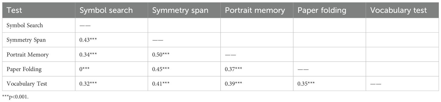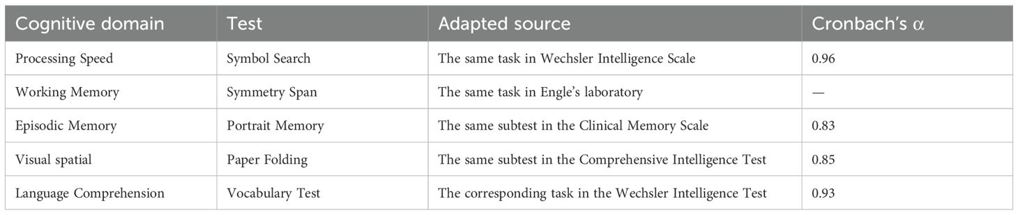 Cognitive function was assessed using the computerized test tool “Primary Cognitive Ability Test (3rd Edition, PCAT III)”, which underwent standardization across 27 cities and counties in 20 provinces nationwide, covering individuals aged 6 to 90 years. The test has been appraised by the Psychological Measurement Committee of the Chinese Psychological Society and has been found to have appropriate difficulty, and it demonstrates good reliability, validity, discriminant validity, and internal consistency (χ2 = 97.99, df = 25, RMSEA = 0.04), meeting psychometric requirements (25). In this study, cognitive performance was assessed using five adapted tasks corresponding to the key domains of the PCAT: Symbol Search (processing speed), Symmetry Span (working memory), Portrait Memory (episodic memory), Paper Folding (visual-spatial memory), and Vocabulary Tests (language comprehension) (26). These tasks incorporate both established and newly developed paradigms. Specifically, the Symbol Search task and Language comprehension are derived from the Wechsler Intelligence Scales (27), while the Symmetry Span task is adapted from protocols developed by the Engle Laboratory at Georgia Institute of Technology (28). The Portrait Memory task draws on materials from the Clinical Memory Scale (29), and the Paper Folding task is based on the classic construct introduced by Ekstrom et al. (30). The internal consistency, reliability, and structural validity of the five cognitive tests in PCAT III were presented in Tables 1, 2.