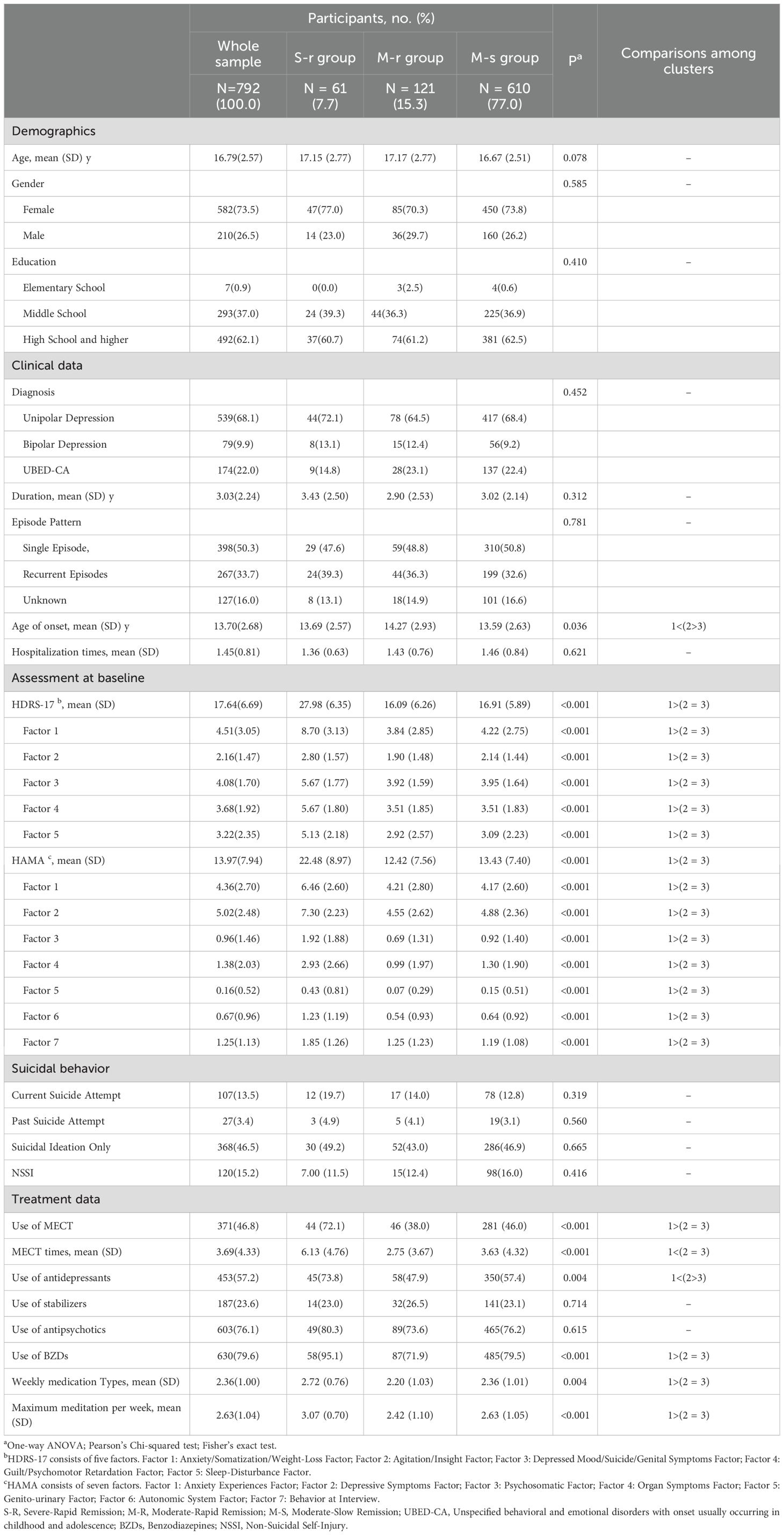 The S-R group (n=61, 7.70%, HDRS-17 = 27.98, SD = 6.35) showed significantly greater baseline severity than other groups (all p-values<0.001). Treatment intensity was highest in this group: 72.1% received MECT (mean 6.13 sessions), 73.8% antidepressants, and 95.1% BZDs (all p-values<0.01). The M-R (n=121, 15.28%; HDRS-17 = 16.09, SD = 6.26) and M-S groups (n=610, 77.02%, HDRS-17 = 16.91, SD = 5.89) showed comparable baseline characteristics (all p-values > 0.05). Additional baseline characteristics are presented in Table 1.