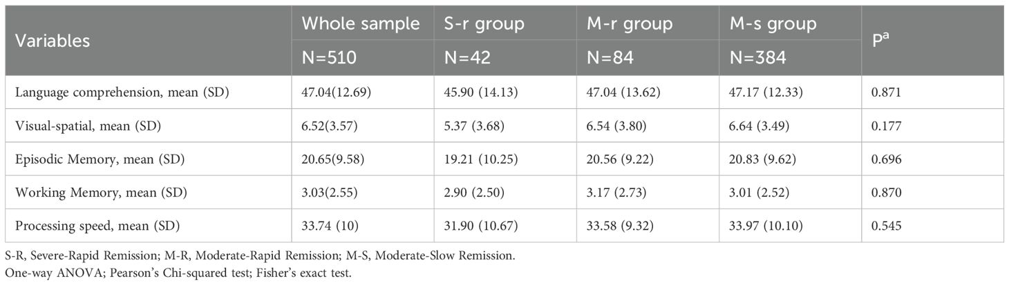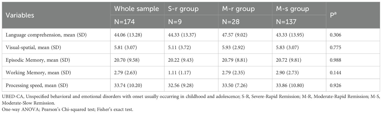 Analysis of baseline cognitive function in all patients (Table 4) and 174 patients with UBED-CA (Table 5) revealed nonsignificant trends (all P > 0.05). The raw scores from each test were used in the analysis, with lower values indicating better cognitive performance. The S-R group showed better performance in four domains (visual-spatial ability, episodic memory, working memory, and processing speed), while the moderate-slow remission group had better language comprehension performance compared with other groups.