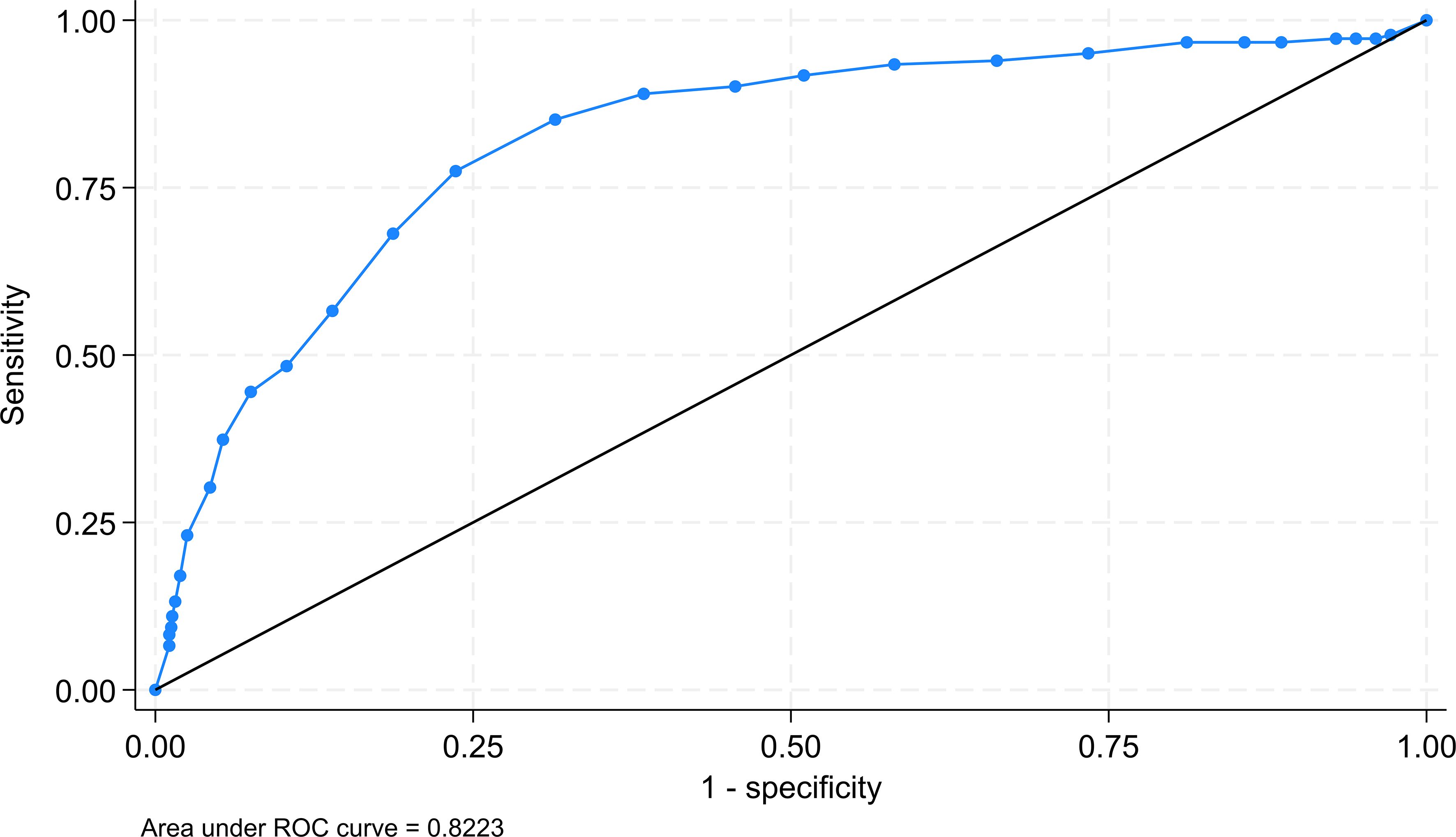 The ROC analysis, using the same “gold” standard and positive diagnosis criteria as the two approaches, resulted in a cutoff point of 22 which provided the highest sensitivity and specificity sum value of 153.9% (Figure 1). This cutoff score corresponded to the score of 20 on the original scale.