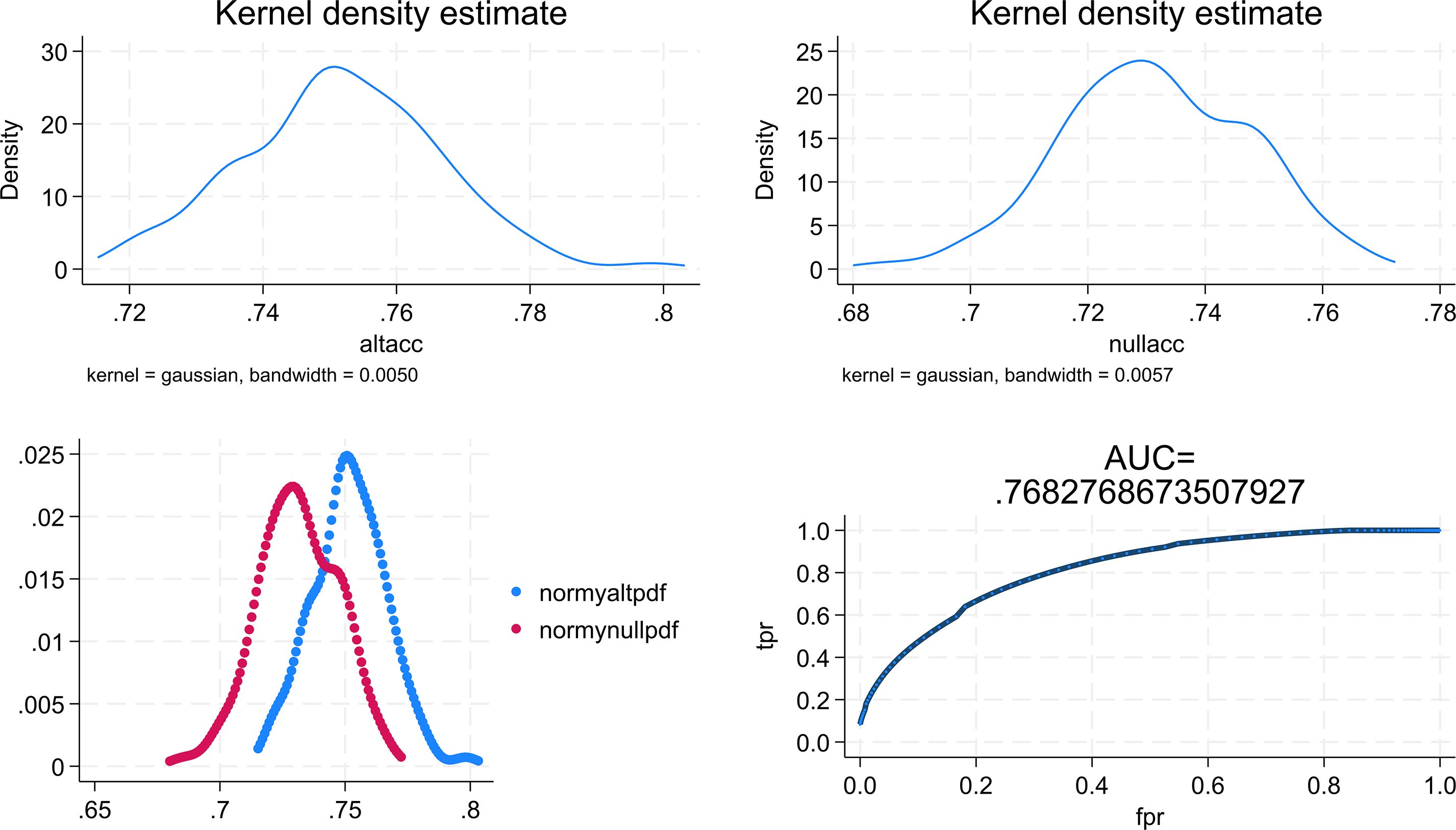 Figure 2. Graphical results obtained from the multiclass ROC analysis. altacc, alternative accuracy; nullacc, null accuracy; mormy nullpdf =estimated probability density function for the null class; normy altpdf, estimated probability density function for the alternative class; tpr, true probability; fpr, false probability.