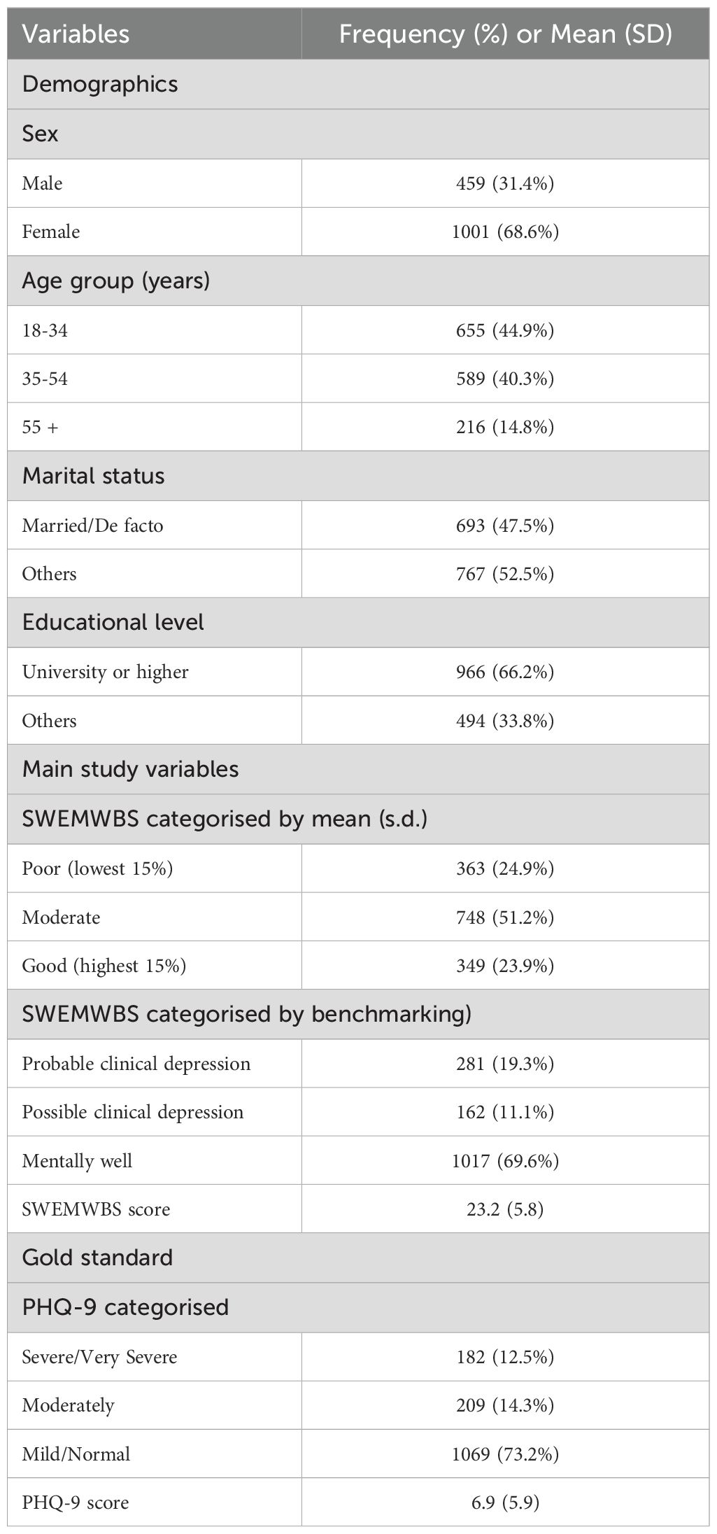 The sample included 1,460 participants, as shown in Table 1. The majority were female (n=1001, 68.6%) and younger, with nearly 45% aged between 18 and 34 years (n=655, 44.9%). Slightly less than half were either married or in a de facto relationship (n=693, 47.5%), and two-thirds had achieved a university-level education or higher (n=966, 66.2%). A total of 672 participants (46%) identified as caregivers. The mean score on the Chinese SWEMWBS was 21.5 (SD = 4.9) out of a possible 35. Of these, 363 (24.9%) were in the lowest 15% of the sample and 281 (19.3%) could be categorised as having probable clinical depression based on the two approaches. For depression, the average scores were 6.9 (SD = 6.0) with 182 (12.5%) classified as severe and very severe depression.