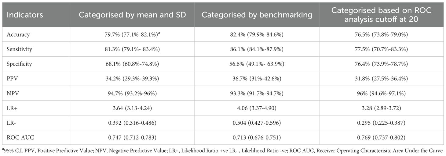 Results: The categorisation of SWEMWBS scores by benchmarking yielded the highest sensitivity, but the smallest specificity with 86.1% (95% C.I. = 84.1%-87.9%) and 56.6% (95% C.I. = 49.1%- 63.9%) respectively. Categorisation using the mean and SD approach resulted in a sensitivity of 81.3% (95% C.I. = 79.1%- 83.4%) and a specificity of 68.1% (95% C.I. = 60.8%-74.8%). In contrast, categorisation using the ROC analysis approach provided a sensitivity of 76.5% (95% C.I. = 73.8%-79.0%) and a specificity of 77.5% (95% C.I. = 70.7%-83.3%). The ROC AUC values were moderately low with the largest being 0.769 (95% C.I. = 0.737-0.802).