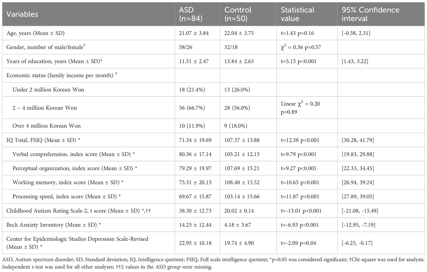 There were no significant differences in age, gender, or economic status between participants with ASD and neurotypical controls. However, ASD participants had fewer years of education, lower SQ and IQ, and higher scores on CARS, BAI, and CES-D compared to controls (Table 1).