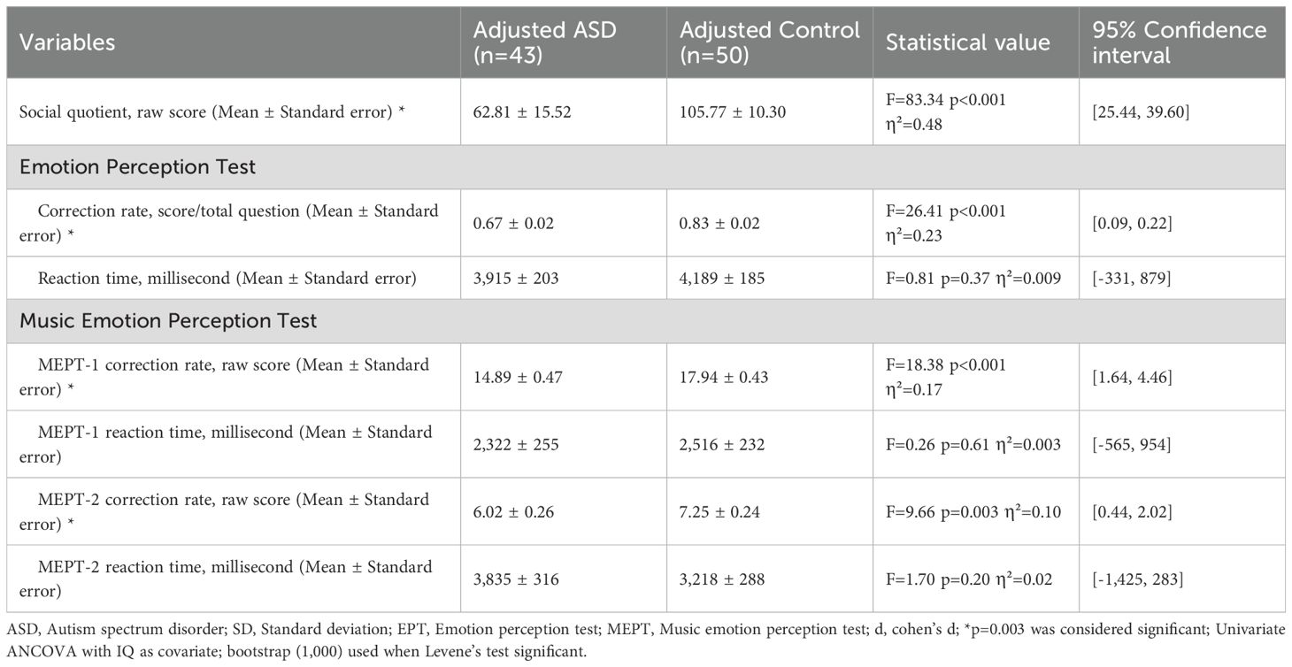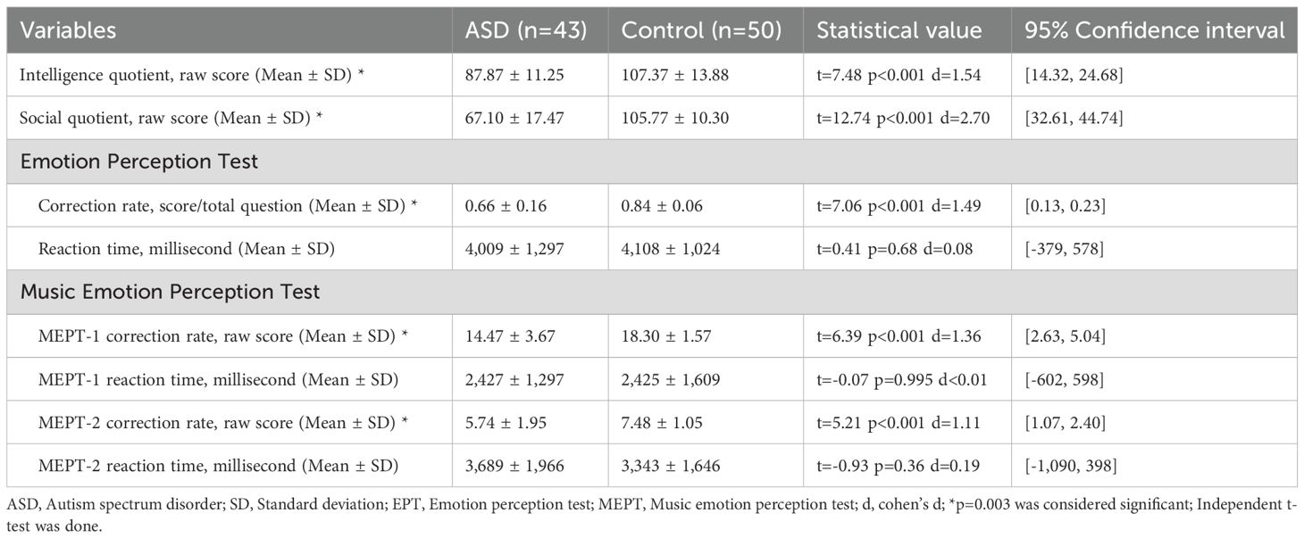 Introduction: This study used music emotion recognition to evaluate emotion perception and aimed to explore the relationship between social maturity and musical emotion recognition in both autism spectrum disorder (ASD) and controls groups.