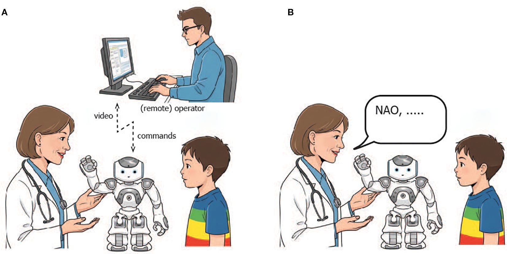 To overcome these challenges, several alternatives have been proposed, ranging from brain–computer interfaces for teleoperation (34) to simplified programming environments designed for children (35). Building on this line of research, the present study evaluates two novel control methods for the NAO robot. The first, Puppet Mode, is a console-based system that allows clinicians to manually operate the robot via a laptop. The second, Assistant Mode, enables NAO to act as a semi-autonomous agent that collaborates with the clinician to engage and distract the child during visits. The aim of this work is to determine which control method is preferred by clinicians, thereby establishing a practical and effective approach for integrating NAO into cardiological visits with autistic patients. To the best of our knowledge, no previous study has compared two distinct control modes for NAO with the specific goal of evaluating their usability and clinical applicability.