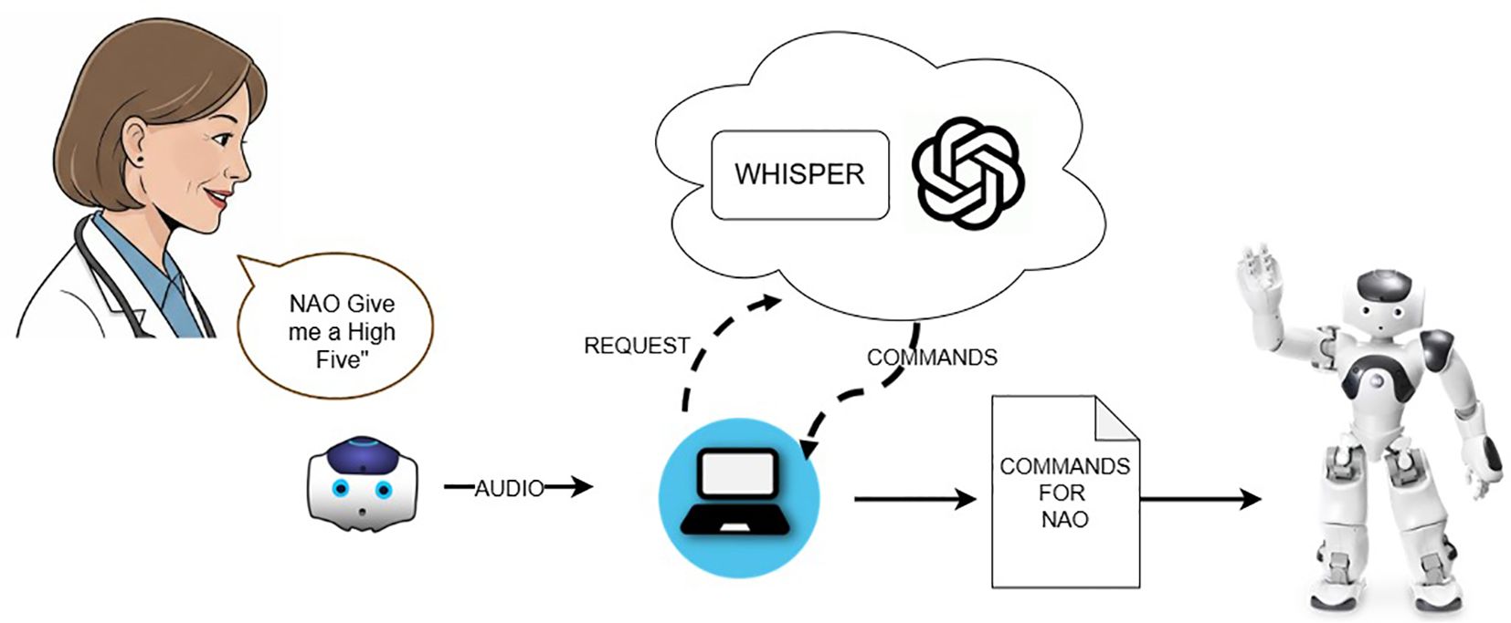 The robot becomes an autonomous assistant that cooperates with the doctor to entertain the patient. In Figure 4, the workflow underlying the interaction between the doctor and the NAO robot is depicted. The doctor asks the NAO to perform an action, and the audio is captured through the NAO’s microphones and transmitted to the laptop. Subsequently, the audio request is transcribed into text using the Whisper service and processed by a Large Language Model (ChatGPT was chosen for this project). The language model returns a list of actions that NAO can perform to fulfill the user’s request through actions and speech commands. The robot then executes these commands.