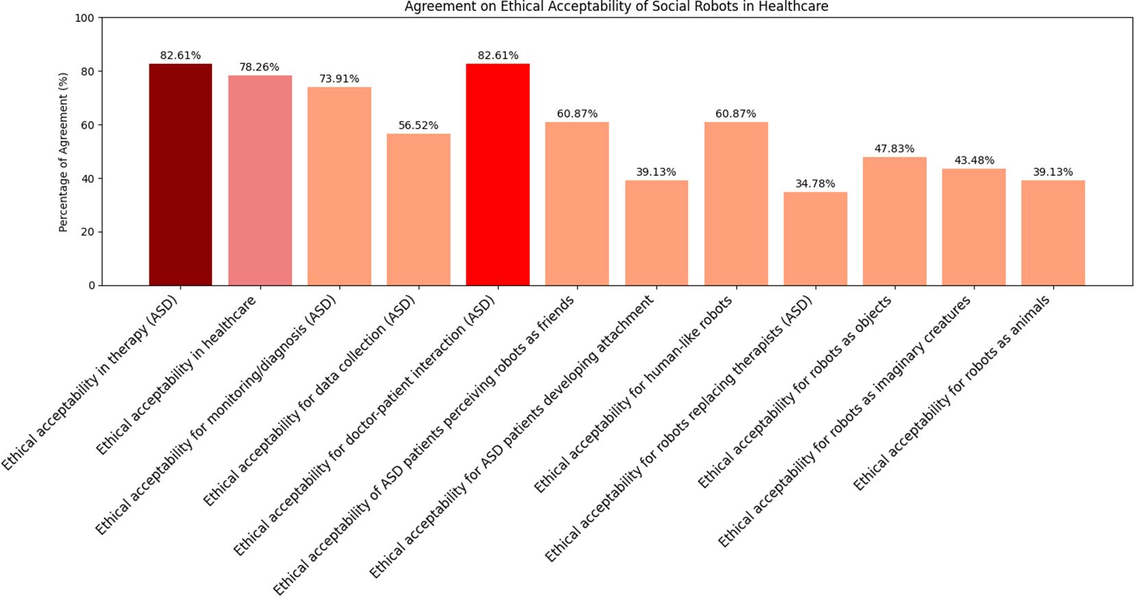 Figure 6. Ethical acceptability of the robot in therapy involving ASD (A), in healthcare (B), in doctor-patient interaction (C).
