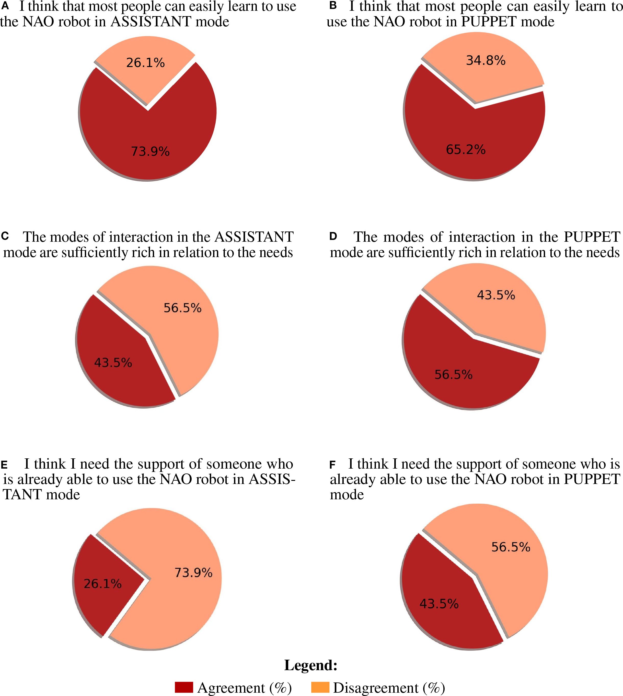 Figure 7. Most impactful agreement (vote 4-5) and disagreement (vote 1-3) percentages for post-video questionnaire. (A) I think that most people can easily learn to use the NAO robot in ASSISTANT mode (B) I think that most people can easily learn to use the NAO robot in PUPPET mode (C) The modes of interaction in the ASSISTANT mode are sufficiently rich in relation to the needs (D) The modes of interaction in the PUPPET mode are sufficiently rich in relation to the needs (E) I think I need the support of someone who is already able to use the NAO robot in ASSISTANT mode (F) I think I need the support of someone who is already able to use the NAO robot in PUPPET mode.