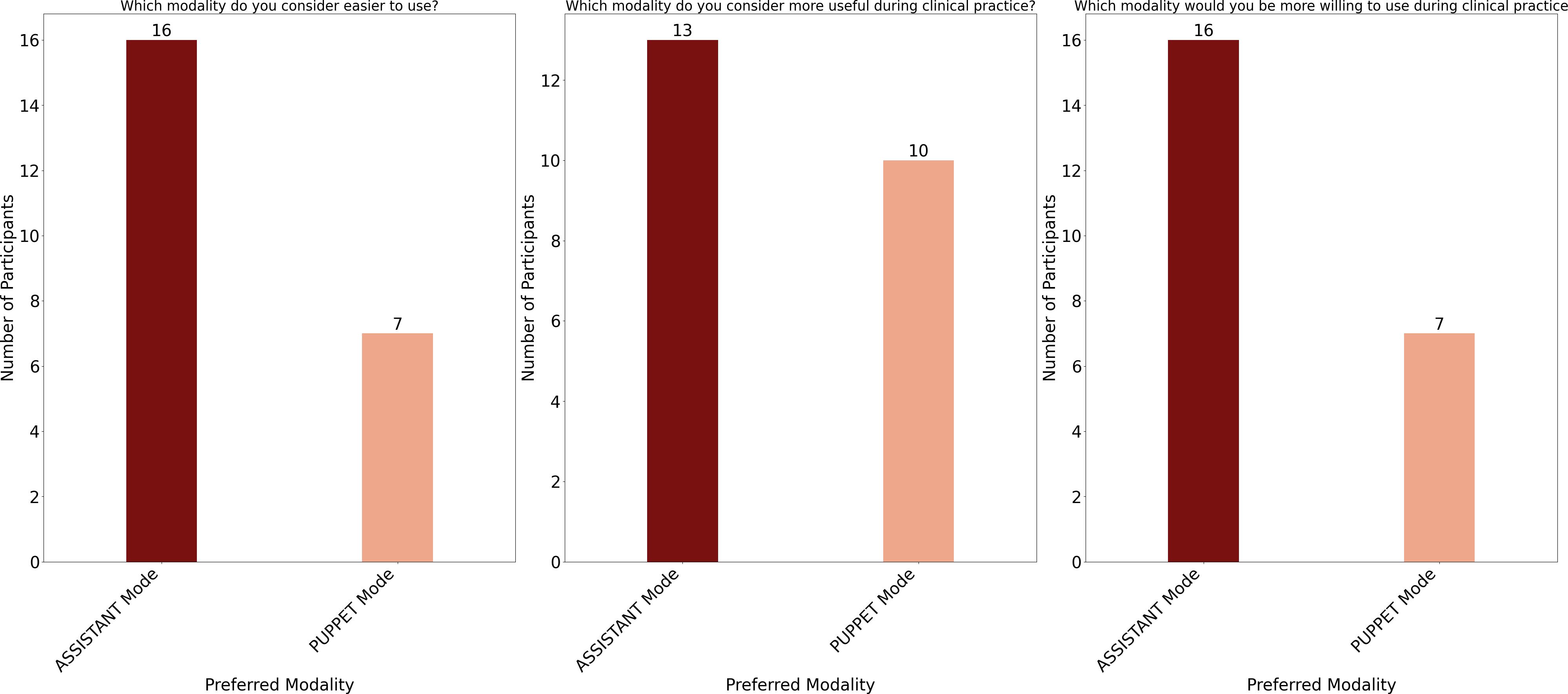 Results: Both modes were considered effective and user-friendly. Assistant mode was perceived as more intuitive and adaptable, facilitating seamless interaction, whereas Puppet mode was judged slightly more reassuring for patients and somewhat more appropriate in terms of robot actions.