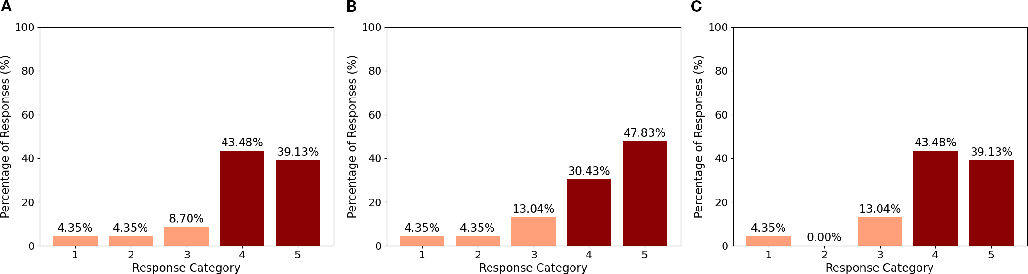 Ethical acceptability of the robot in therapy involving ASD (A), in healthcare (B), in doctor-patient interaction (C).
