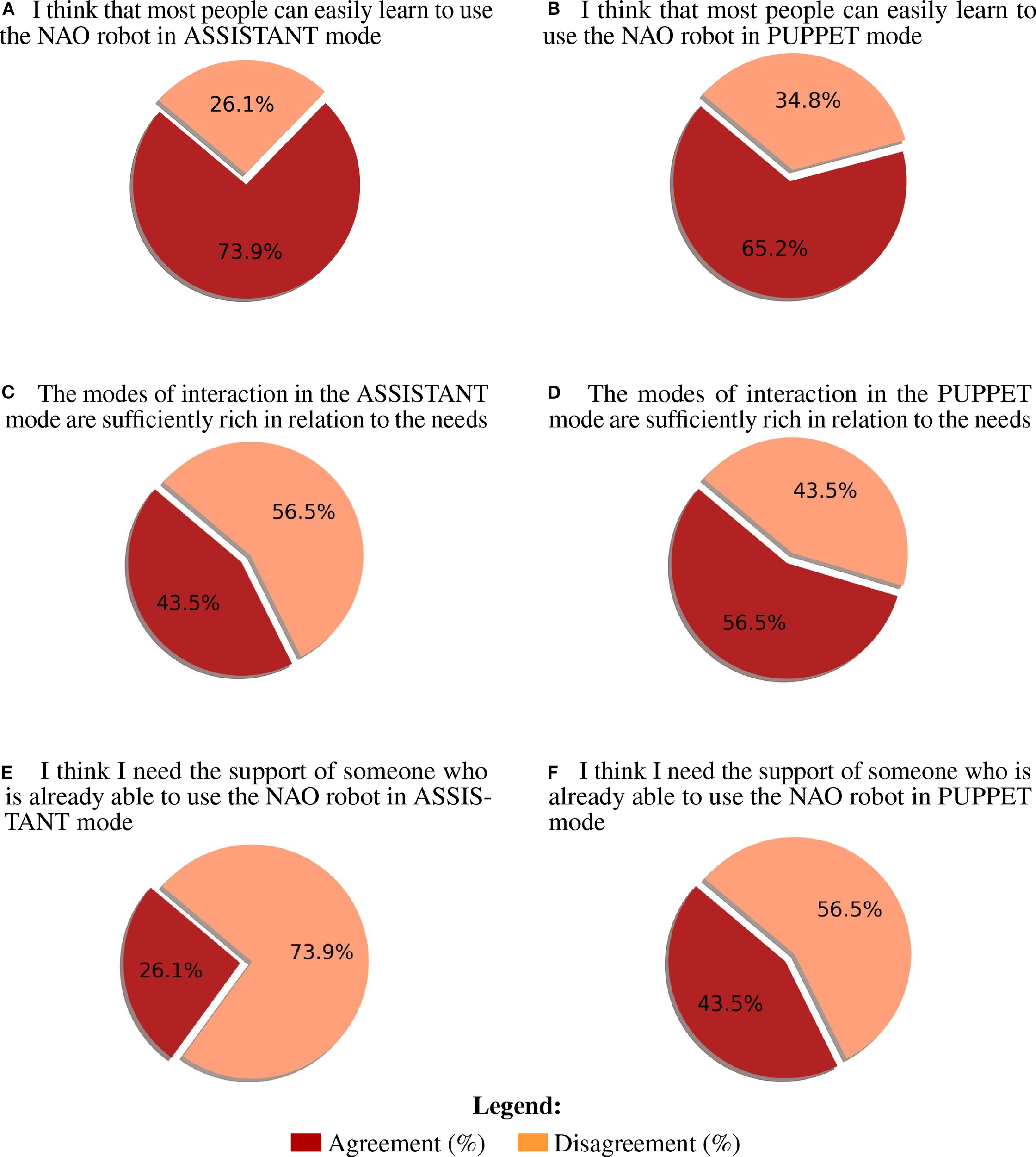 Most impactful agreement (vote 4-5) and disagreement (vote 1-3) percentages for post-video questionnaire. (A) I think that most people can easily learn to use the NAO robot in ASSISTANT mode (B) I think that most people can easily learn to use the NAO robot in PUPPET mode (C) The modes of interaction in the ASSISTANT mode are sufficiently rich in relation to the needs (D) The modes of interaction in the PUPPET mode are sufficiently rich in relation to the needs (E) I think I need the support of someone who is already able to use the NAO robot in ASSISTANT mode (F) I think I need the support of someone who is already able to use the NAO robot in PUPPET mode.