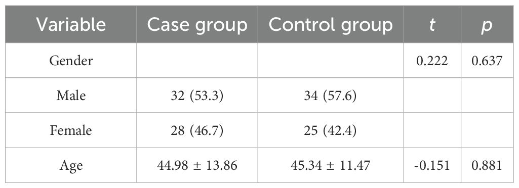 The case group comprised 60 patients with schizophrenia (age range: 21–83 years; mean ± SD: 44.98 ± 13.86), including 32 males and 28 females. The control group consisted of 59 individuals (age range: 20–80 years; mean ± SD: 45.34 ± 11.47), including 34 males and 25 females (Table 1). Baseline comparisons indicated no significant differences between the two groups in age (t=-0.151, p=0.881) or gender distribution (χ2 = 0.222, p=0.637). No participants withdrew during the study period.