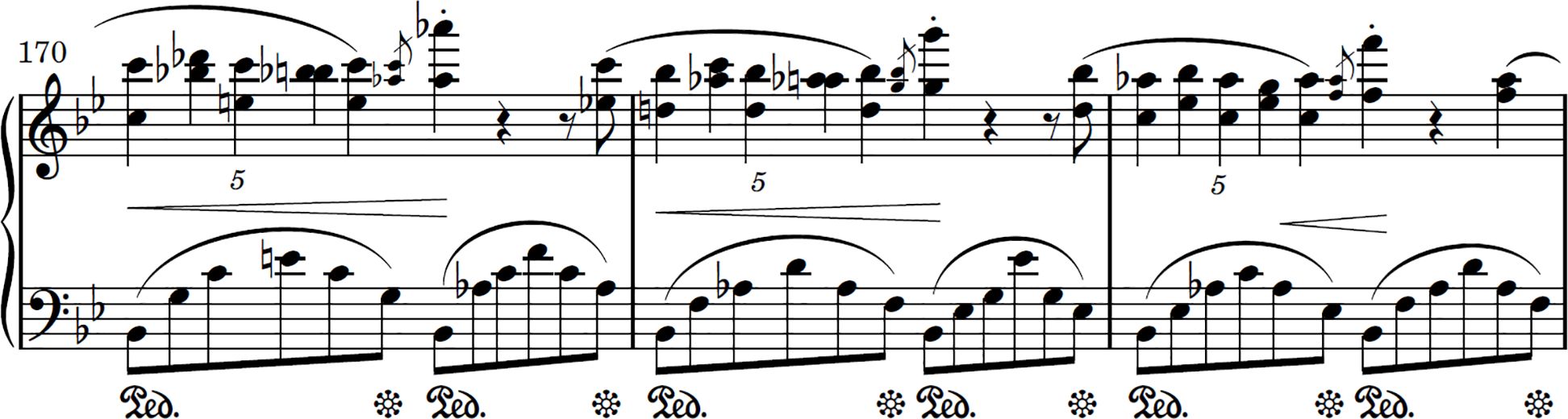 Through personal performance practice and experience, we observed the prowess of non-serial learning and practicing in breaking serial associative chains. Consider the excerpt from Chopin’s (57) first ballade (Figure 1). It is commonplace for bars 170 to 172 to form a serial associative chain so that, relative to bar 170, the content of bar 171 or 172 is less readily accessible. The retrievability of bar 171 often hinges heavily, if not wholly, on first executing bar 170 successfully; likewise, bar 172 relies on bar 171. Evidently, where a pianist fails to execute bar 170 successfully, bar 171 and, by extension, bar 172 also cannot be recovered. Indeed, such is the severe cost to basic cognitive systems that function in a serial recall manner. Consequently, we noticed one cannot successfully start performing a piece from just anywhere, but must do so from the piece’s outset or at best the beginning of a section. For a singer, one often cannot directly recall what words in a ballad rhyme with ee or even what happens in the last stanza, but has to in fact sing the ballad, listen for ee sounds and pay attention to the last stanza when one gets to it (52). Similarly, we observed that a pianist in performance often cannot directly pinpoint the exact notes that particular bars contain, and would have to “play to know” when one gets to each of those bars. Under this light, one ought to not practice bars 170 to 172 of Chopin’s ballade categorically. Toward dissolving serial associate chains, a pianist could, for instance, subdivide each bar into smaller halves and begin practicing each bar from its midpoint—from bar 170b to 171a; from bar 171b to 172a, thereby strengthening content-addressable memory access for optimizing stage performance. We encourage empirical investigations in systematically assessing the efficacy of non-serial practice, and welcome collaborations.