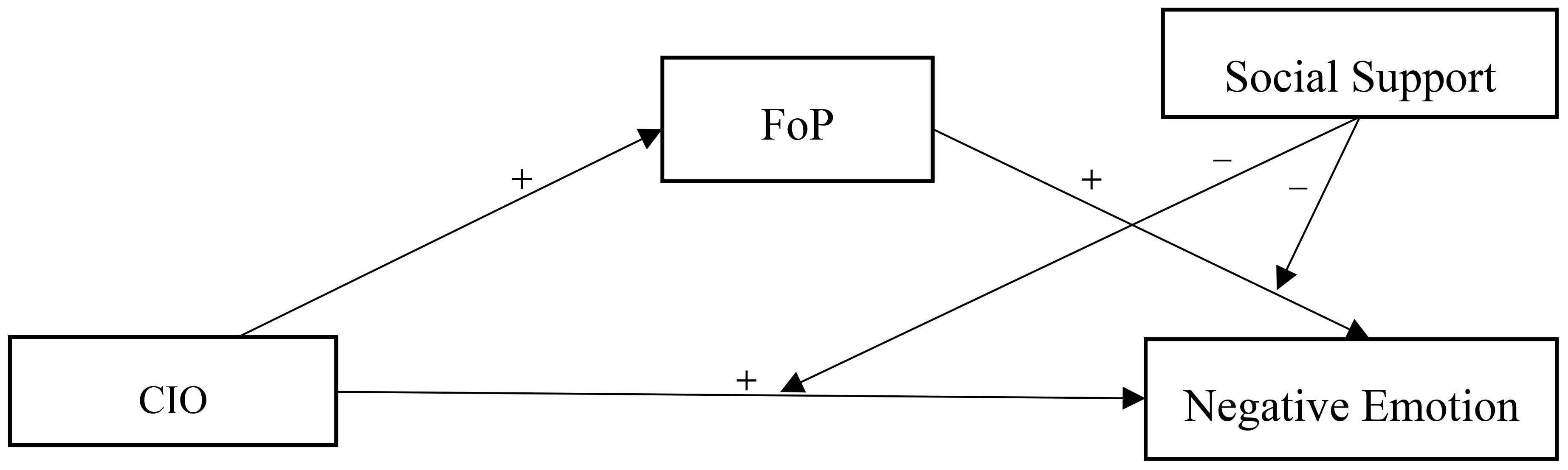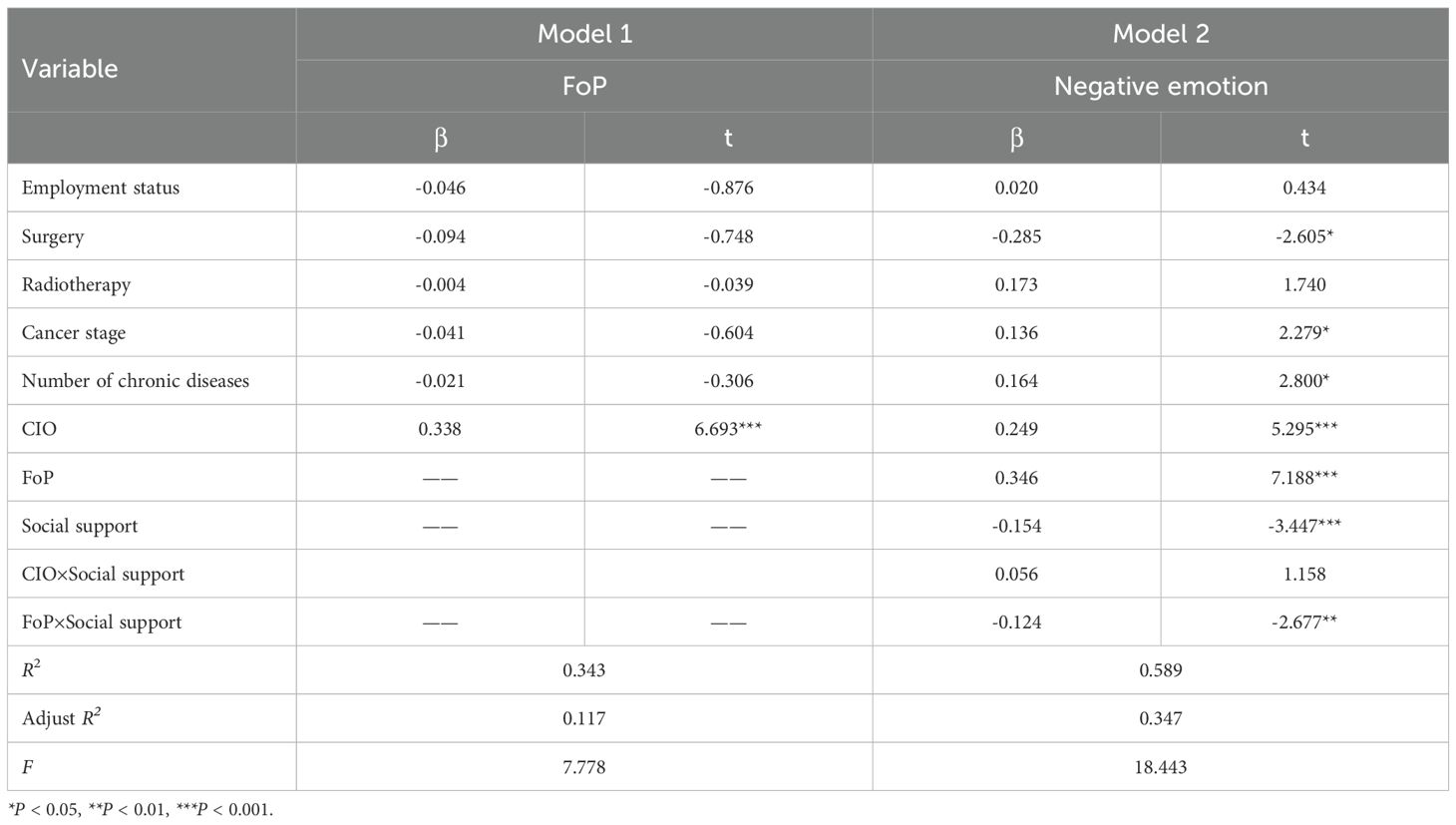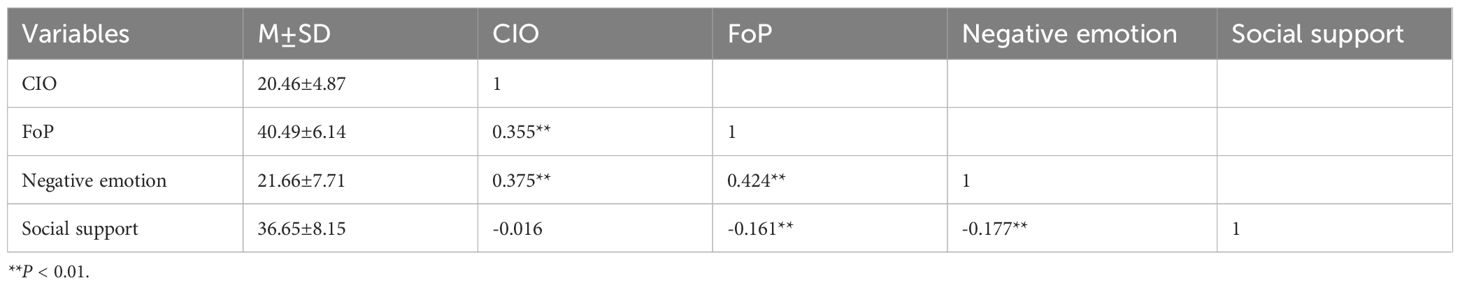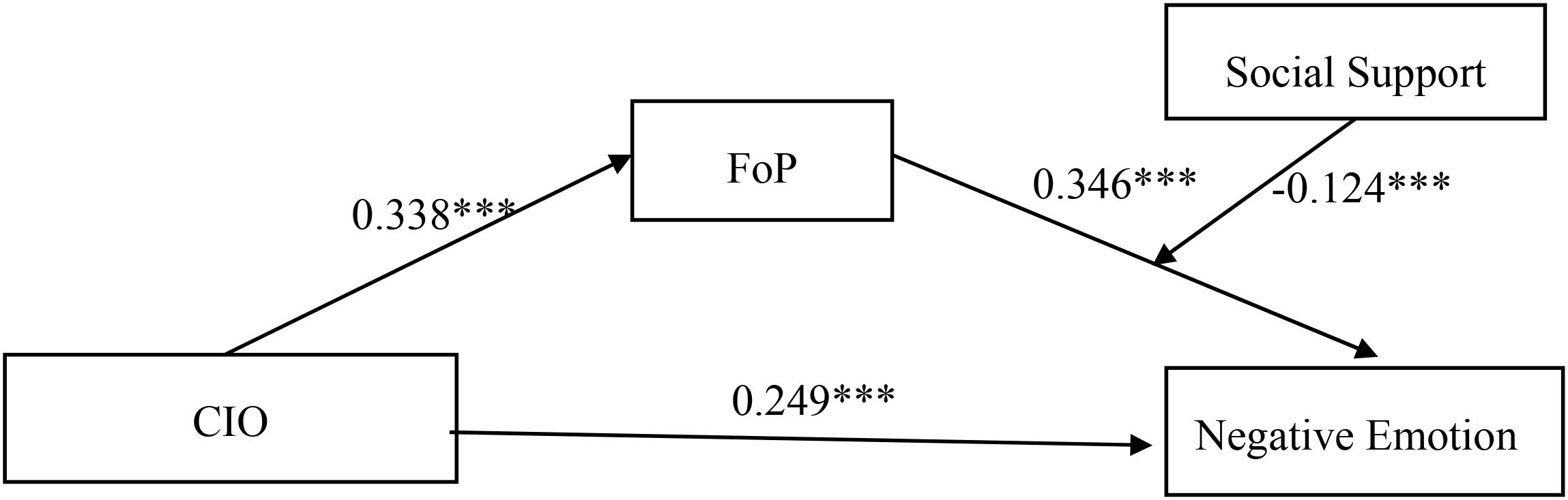 Results: The incidence of anxiety was 56.1% (201/358), and the incidence of depression was 53.1% (190/358). CIO had a positive predictive effect on FoP (β=0.338, P < 0.001) and negative emotion (β=0.375, P < 0.001). FoP has a positive predictive effect on negative emotion (β=0.342, P < 0.001), and FoP plays a mediating role between CIO and negative emotion (β= 0.115, 95%CI=[0.072, 0.166]). Social support plays a negative moderating role between FoP and negative emotion, with a moderating index of -0.124 and 95%CI=[-0.214,-0.033].
