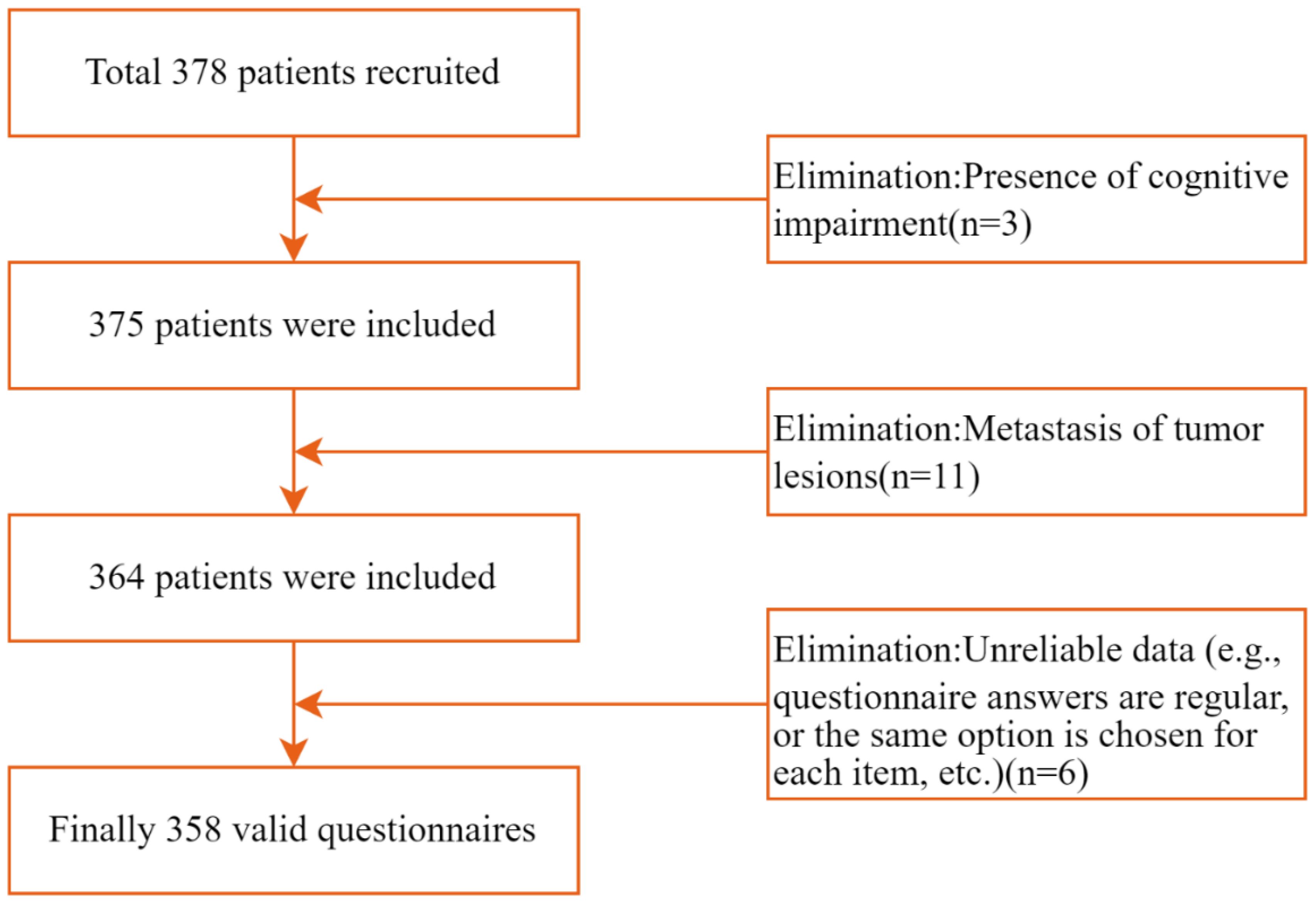 Based on the linear regression model, the required sample size was calculated using G*Power software (Version 3.1) (33), set Power to 0.95 and Alpha to 0.05 according to Cohen’s standard (34)., Assuming an effect size f2 of 0.15 (moderate effect size) and 17 independent variables involved in this study [(including CIO, FoP, Social Support, and 14 variables covered in demographic and disease-related data)], G*Power calculated the required sample size to be 208. Considering a 10% attrition rate, the estimated minimum sample size required is 229 cases. A total of 378 lung cancer patients were recruited to complete the questionnaire. Three patients were excluded due to cognitive impairments, and 11 patients were excluded due to tumor metastasis. After the questionnaires were returned, six were excluded due to unreliable data (e.g., consistent patterns in responses or identical selections for each item). Ultimately, 358 valid questionnaires were recovered, yielding an effective recovery rate of 94.9%. Figure 2 illustrates the participant selection process.