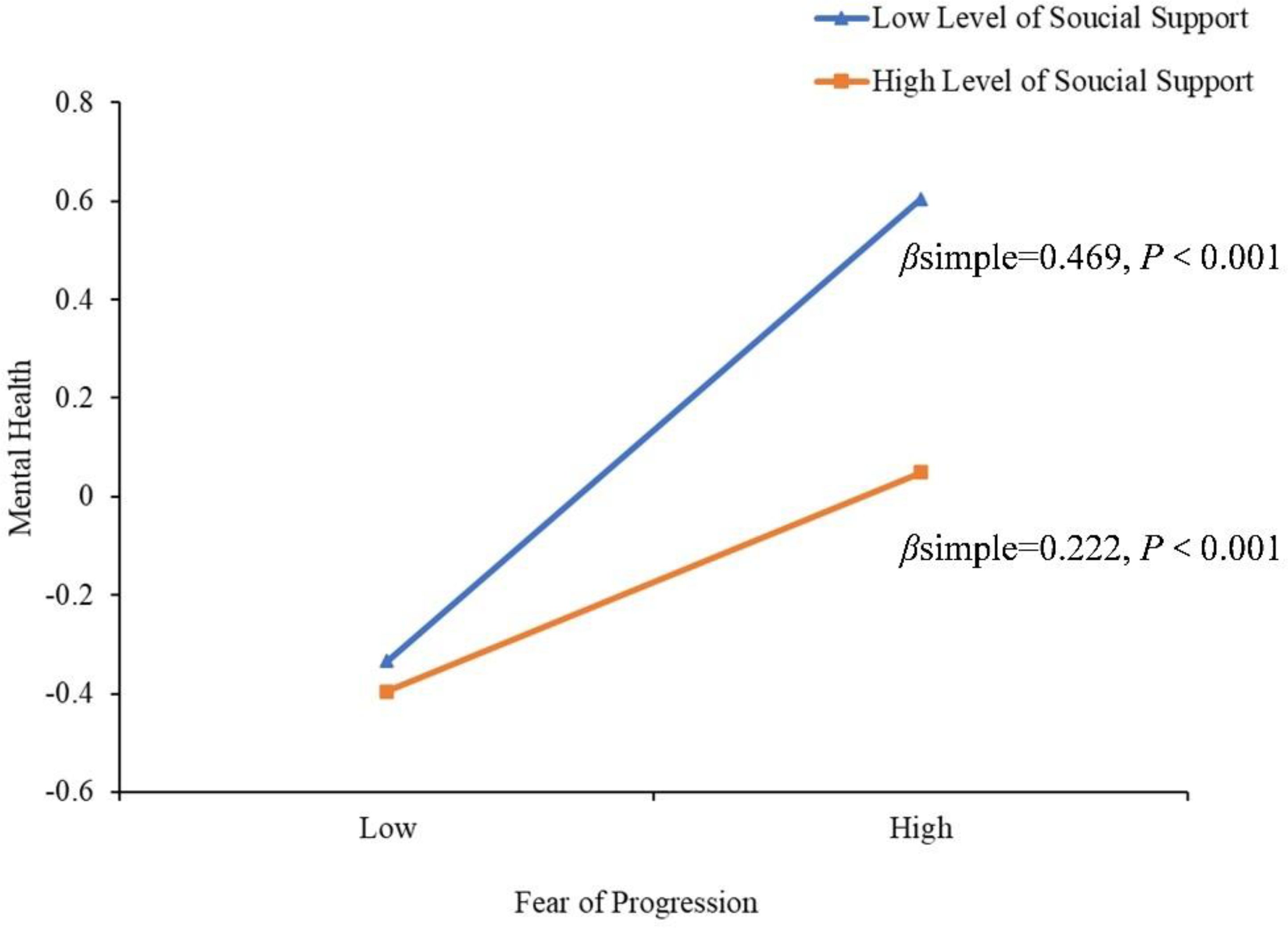 To better understand the moderating effect of social support on FoP and negative emotion, a simple slope test was used for analysis. As shown in Figure 4, when social support was at a low level (M-1SD), the positive predictive effect of FoP on negative emotion was significant in newly diagnosed lung cancer patients (β simple = 0.469, P < 0.001). When social support is at a high level (M + 1SD), the positive predictive effect of FoP on negative emotion is also significant (β simple = 0.222, P < 0.001), but the predictive effect is relatively reduced. Therefore, as social support increases, the predictive effect of FoP on negative emotion shows a gradually decreasing trend, and social support plays a moderating role in the influence of FoP on negative emotion.