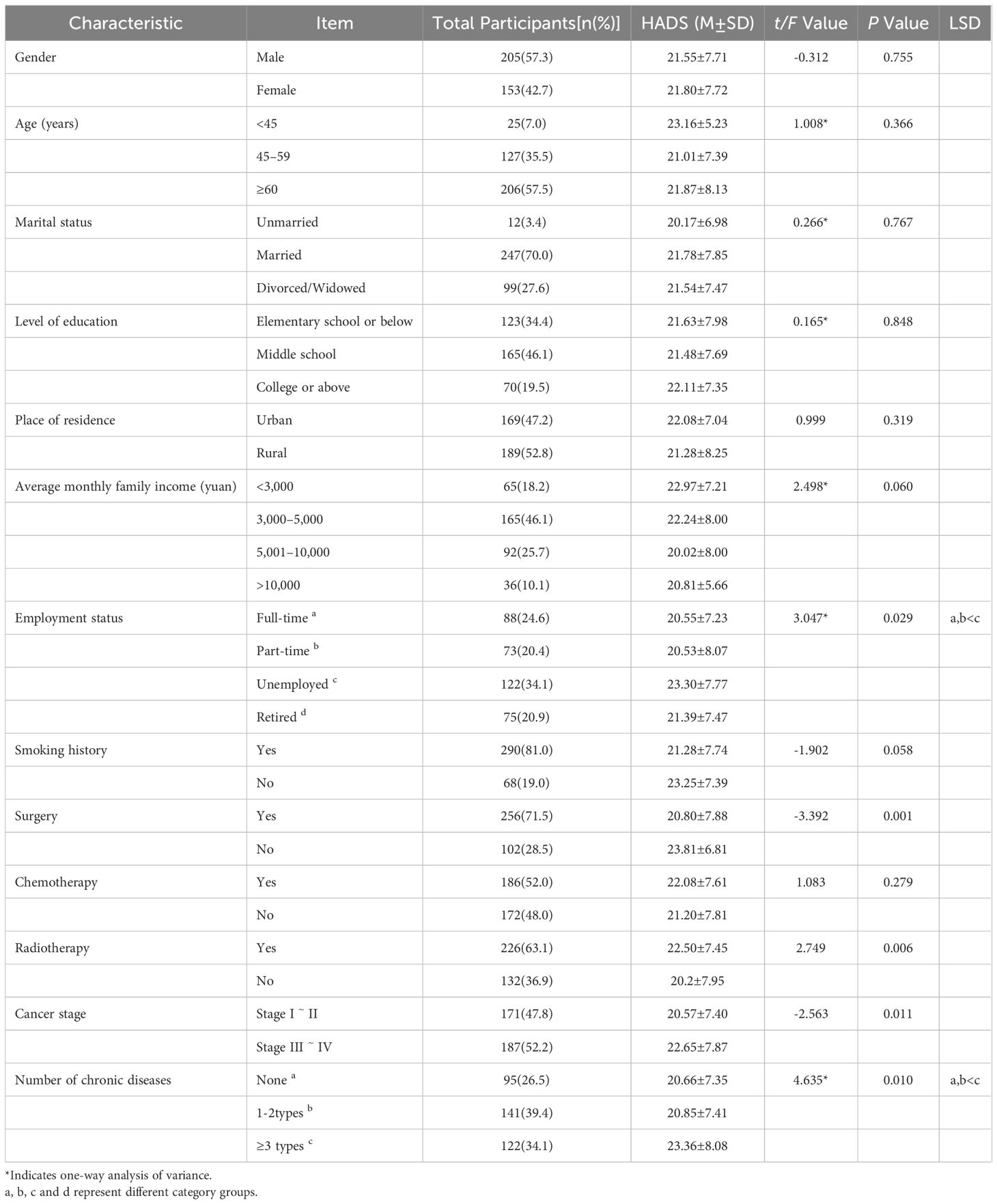 This study’s results indicate statistically significant variations in negative emotion scores among newly diagnosed lung cancer patients across factors like employment status, surgery history, radiotherapy, cancer stage, and number of comorbid chronic conditions (P < 0.05). Additionally, the prevalence of anxiety and depression was calculated, with anxiety affecting 56.1% (201/358) and depression affecting 53.1% (190/358) of participants. The details as shown in Table 1.