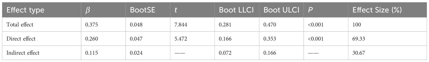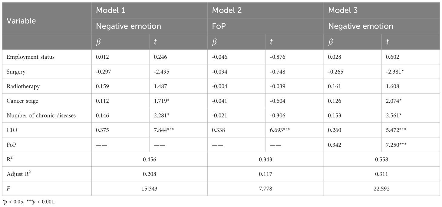 Further applying the bias-corrected Bootstrap method with 5,000 resampling iterations, the results indicate that CIO has a significant indirect effect on negative emotions in newly diagnosed lung cancer patients through FoP: β = 0.115, SE = 0.024, 95% CI = [0.072, 0.166]. The direct effect of CIO (0.260) and the mediating effect of FoP (0.115) account for 69.33% and 30.67% of the total effect, respectively. Therefore, the mediating role of FoP between CIO and negative emotion is validated. As shown in Table 4.