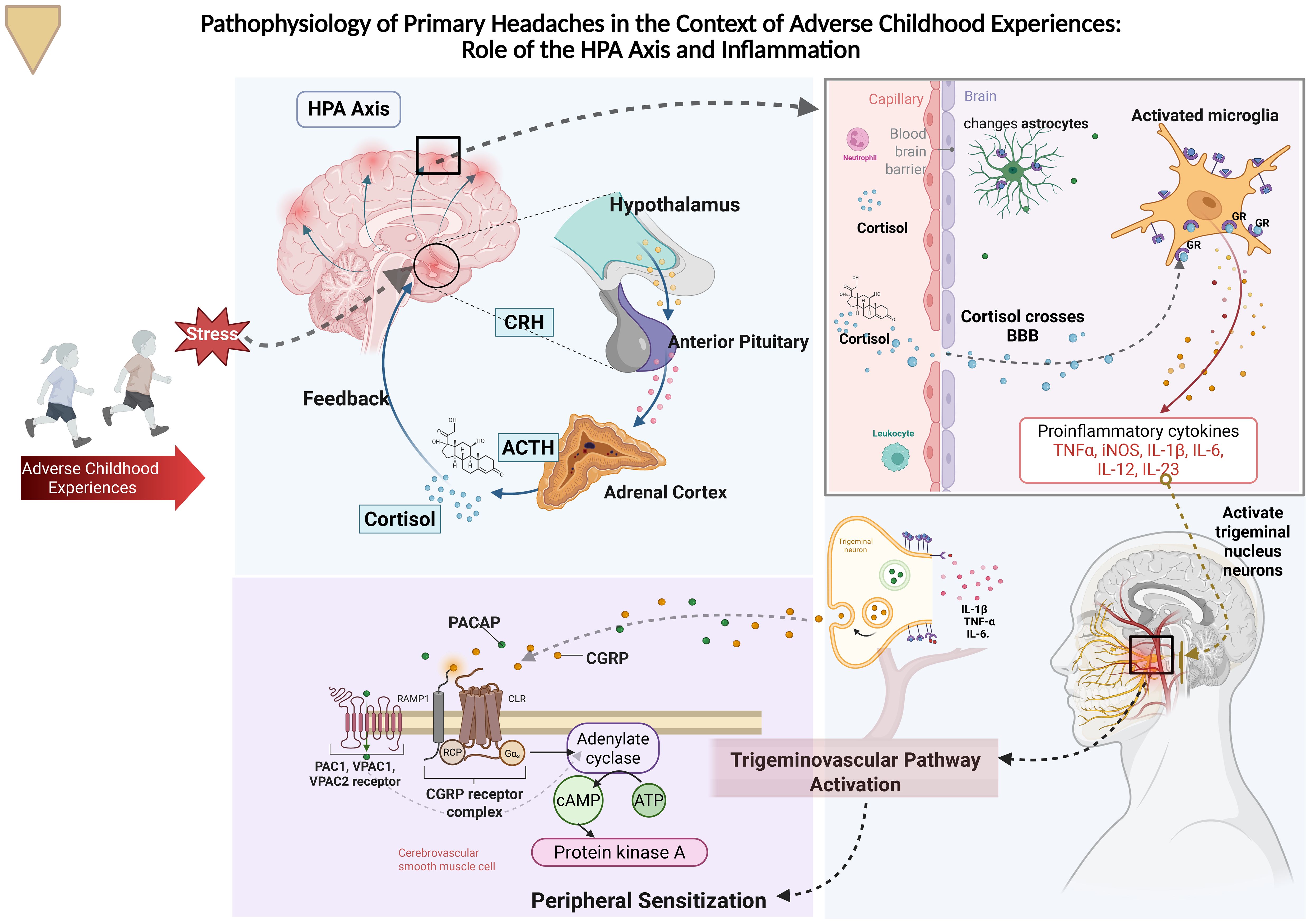 Figure 1. Adverse childhood experiences (ACEs) chronically activate the HPA axis, elevating cortisol, adrenaline, cytokines, and CGRP, which affect neuronal development and emotional regulation. This dysfunction can predispose individuals to the development of primary headaches, such as migraine, tension-type headache, and trigemino-autonomic headaches, by sensitizing the trigeminovascular system. Additionally, chronic inflammation and altered stress response increase the risk of physical and emotional illnesses, as well as premature death. HPA axis, Hypothalamic-Pituitary-Adrenal axis; CRH, Corticotropin-Releasing Hormone; ACTH, Adrenocorticotropic Hormone; IL-1β, Interleukin-1 beta; TNF-α, Tumor Necrosis Factor alpha; IL-6, Interleukin-6; PACAP, Pituitary Adenylate Cyclase-Activating Polypeptide; CGRP, Calcitonin Gene-Related Peptide; PAC1, PACAP Receptor 1; VPAC1, Vasoactive Intestinal Peptide/PACAP Receptor 1; VPAC2, Vasoactive Intestinal Peptide/PACAP Receptor 2; RCP, Receptor Component Protein; Gαs, Stimulatory G Protein alpha subunit; cAMP, Cyclic Adenosine Monophosphate; ATP, Adenosine Triphosphate.