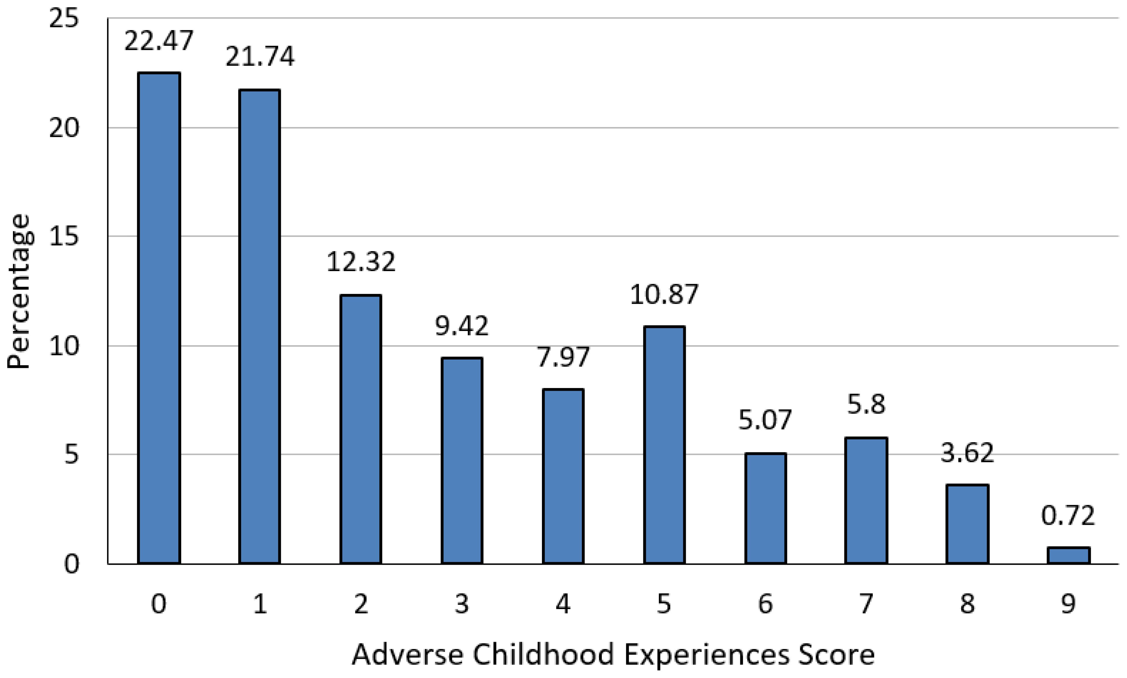 Additionally, it was observed that 22.46% of the population did not report any ACEs. Among those who did, 21.4% reported a single event, while 10.87% experienced five events (Figure 2).