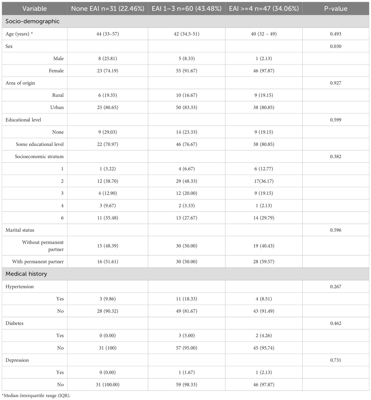 A total of 138 patients with primary headache were evaluated, of which 77.54% presented some form of ACE, and 34.06% scored 4 or higher. In the analyzed population, 89.86% were women, with statistically significant differences observed across groups. The median age ranged between 40 and 44 years, with the highest median age observed in the group without ACE (median: 44 years, IQR: 33-57). In all three groups, over 80% of the subjects were from urban areas, and the socioeconomic status was similarly distributed, with strata 2 and 6 predominating. Marital status was evenly distributed, with no statistically significant differences. Regarding medical history, hypertension was more prevalent in the group with ACE 1-3 (18.33%), although no statistically significant differences were found between the groups, and the prevalence of diabetes and depression was below 3% (Table 1).