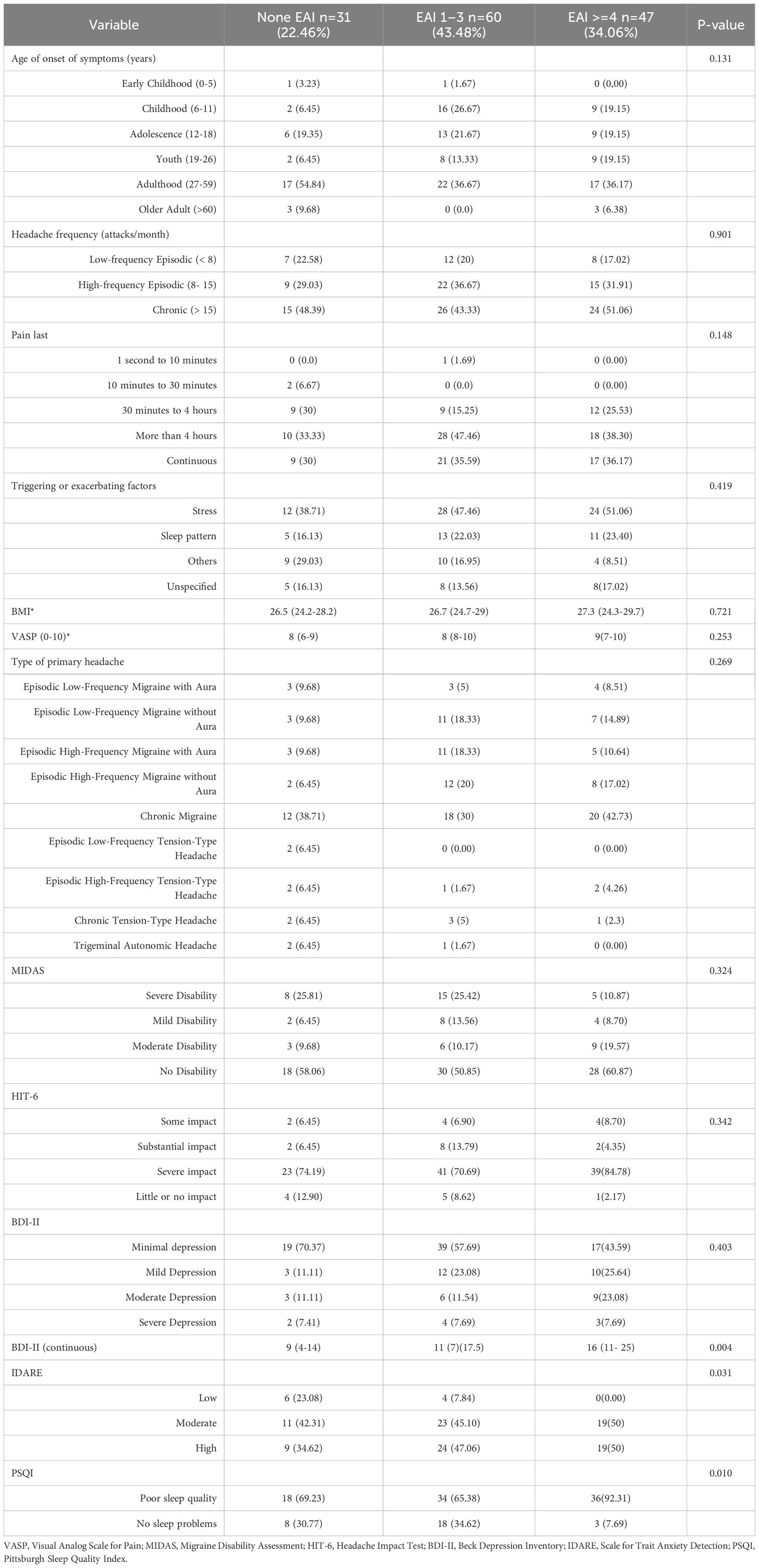 Demographic variables included age, sex, marital status, education level, and socioeconomic status. Additionally, the classification of primary headache, the presence of non-communicable chronic diseases, exacerbating factors, pain last, headache frequency, age of onset of symptoms and scores on various scales and questionnaires were recorded, such as the Beck Depression Inventory-II (BDI-II Scale) for measuring depression severity (18), the Adverse Childhood Experiences Questionnaire (19), the Headache Impact Test (HIT-6 Scale) for measuring the impact of headaches on functionality (20, 21), the Visual Analog Scale for Pain (VASP) (21), the Pittsburgh Sleep Quality Index (PSQI) (22), and the Migraine Disability Assessment scales (MIDAS) for measuring the degree of disability secondary to migraine (23).