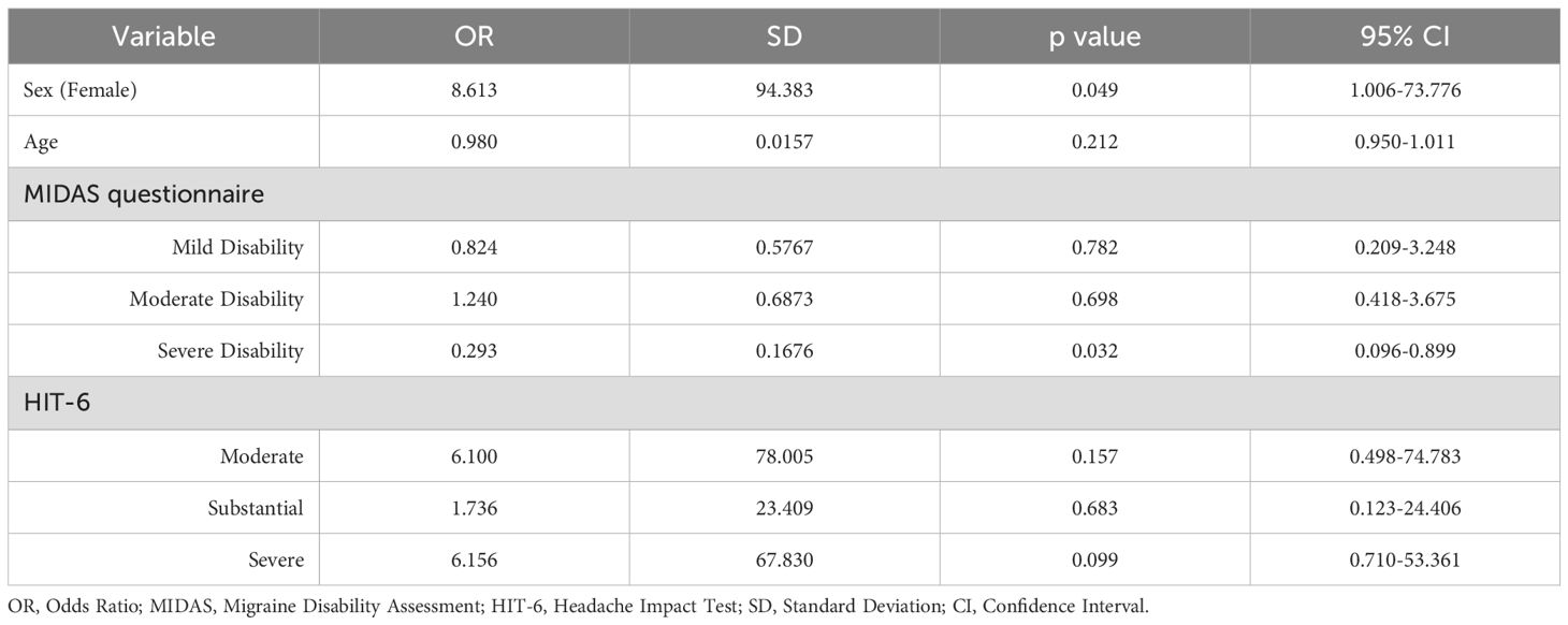 Methods: A cross-sectional study was conducted at a Colombian high-complexity institution, including adults with primary headaches according to ICHD-3 criteria. Statistical analysis involved bivariate comparisons and multivariate logistic regression, with goodness-of-fit assessed using the Hosmer and Lemeshow test. All analyses were performed using Stata 16.