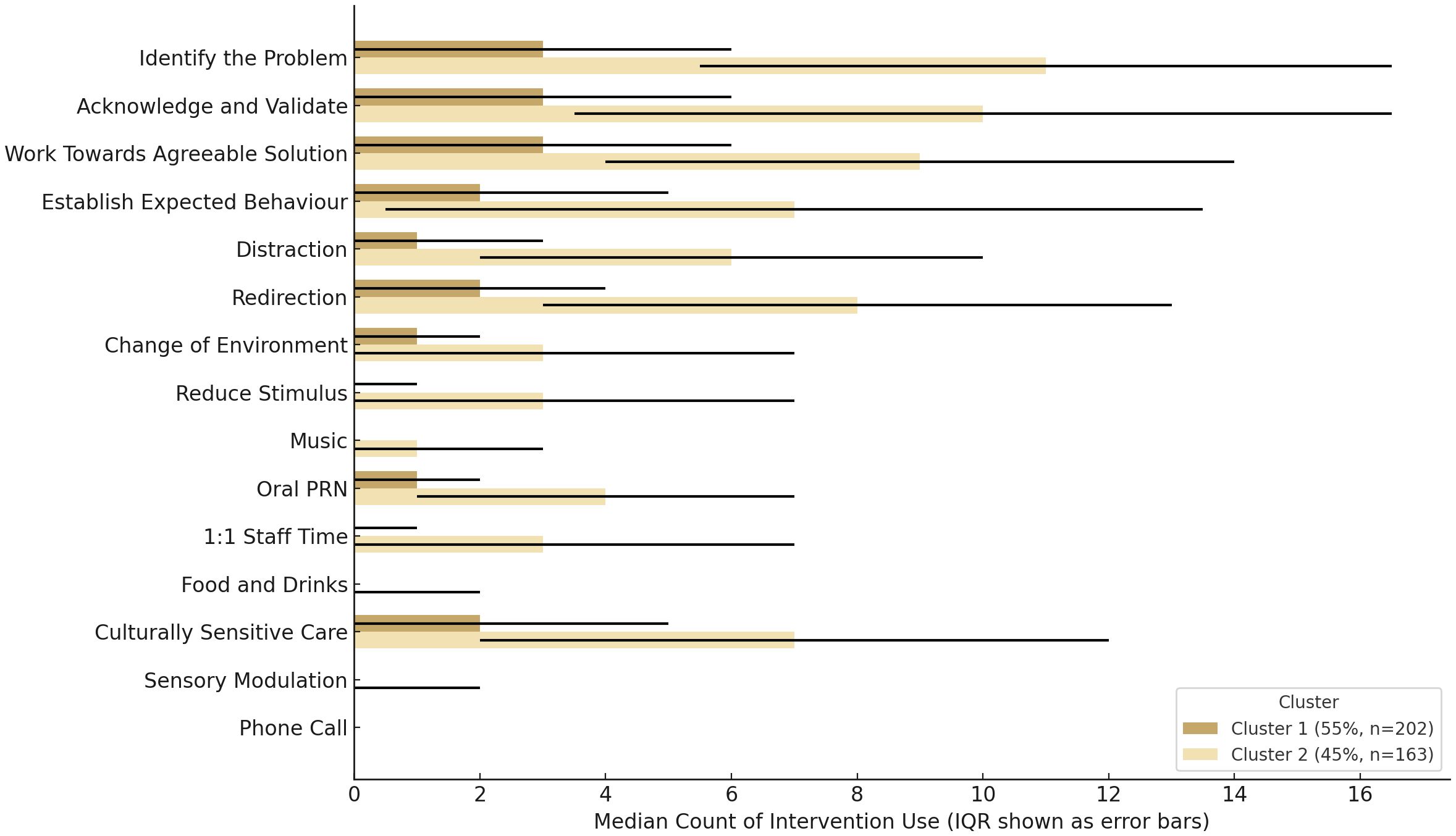 The silhouette plot showed that two clusters of co-occurring de-escalation practices provided the optimal solution (see page 4 of the Supplementary Materials), which is supported by a CCC of 0.79 that reflects a stable clustering. Consequently, each daily aggregate of log data was assigned a cluster. In 202 days (55%) of the implementation year, nurses responded to prompts of de-escalation through the Safe Steps and a range of co-occurring practices (Cluster 1), including distraction, redirection, change of environment, as-needed oral medication response to behavioural disturbances, and culturally sensitive care (see Figure 1). For the rest of the year, in addition to the co-occurring practices in Cluster 1, nurses also applied one-on-one staff time, reduced stimulus, and music, while using the Safe Steps variably (Cluster 2). Cluster 2 is higher by three total restrictive practice events per 1,000 occupied bed days than Cluster 1, and by 11 hours of total restrictive practice duration per 1,000 occupied bed days (see Table 5). However, the difference between Clusters 2 and 1 on all outcome measures is not statistically significant. At a frequency level, the Safe Steps was used most often at time point 2 of the implementation year, followed by time points 3, 4, and 1.