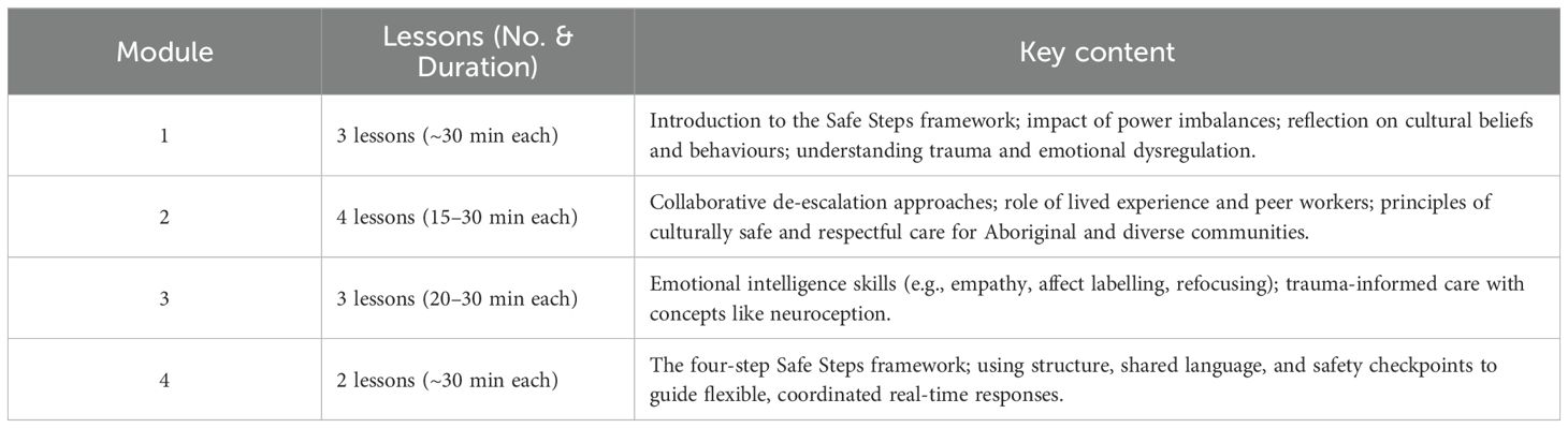 In an adult mental health inpatient unit in regional New South Wales (NSW), Australia, a four-step approach to de-escalation, with tiered levels of complexity, was developed by a clinician in response to persistently high rates of physical restraint and seclusion, as well as the lack of clear, consistent guidance available to nurses on de-escalation (32). This approach was intended to bring order to how nurses hold space for the person in distress to explore their situation, feel listened to, discuss next steps collaboratively, and make sense of what actions may support exercising the following steps when the conversation is over. An earlier cluster analysis and between-cluster comparison, using a separate dataset, for discerning the most active co-occurring relational capabilities employed by nurses in the acute inpatient unit provides support for the structure and progression of the four-step approach (33). The steps were anchored in values of emotional intelligence, trauma-informed care, and personal recovery, which were emphasised in training on the approach. A separate feature analysis offers evidence for the importance of additional values, including cultivating situational and contextual awareness in early signs work and promoting autonomy-preserving de-escalation in inherently restrictive environments (34). These values were made explicit in tailoring practice through feedback loops in restrictive practice reviews. A separate weighted before-and-after analysis indicated that these restrictive practice reviews, conducted by a nurse unit manager with nurses as review participants and nurses’ practice of relational capabilities as a core review content, were associated with a significant reduction in seclusion in the acute inpatient unit (35). Taken together, the (i) four-step approach to therapeutic responding, implemented with the support of a (ii) phased training on the approach and the underlying values, and (iii) regular restrictive practice review meetings, comprise the Safe Steps for De-escalation, or simply the Safe Steps.