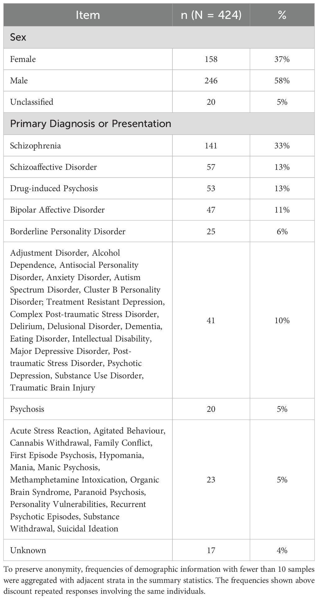 This study involving humans was approved by a human research ethics committee (HREC) in an LHD within NSW, Australia (2023/PID00297 - 2023/ETH00272) in March 2023. In May 2023, further ethical approval was received from a university HREC through the minimisation of duplication of ethical review application (Approval Number: 2023/069). This study was conducted in accordance with the local legislation and institutional requirements. The ethics committee/institutional review board waived the requirement of written informed consent for participation from the participants or the participants’ legal guardians/next of kin, because no identifiable data were collected or re-identifiable. Nurses’ completion of de-escalation logs was considered implied consent, with no nurse identifiers recorded. Approval was granted to report aggregate sex and diagnosis data for people involved in de-escalation. Identifiable details were collected only to support log completion, then removed by a project team member not involved in the analysis. A random study code replaced identifiers before data were shared with the first author, who remained blinded to participant identities.