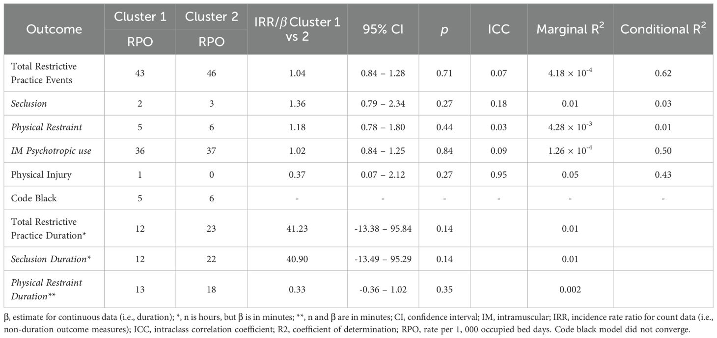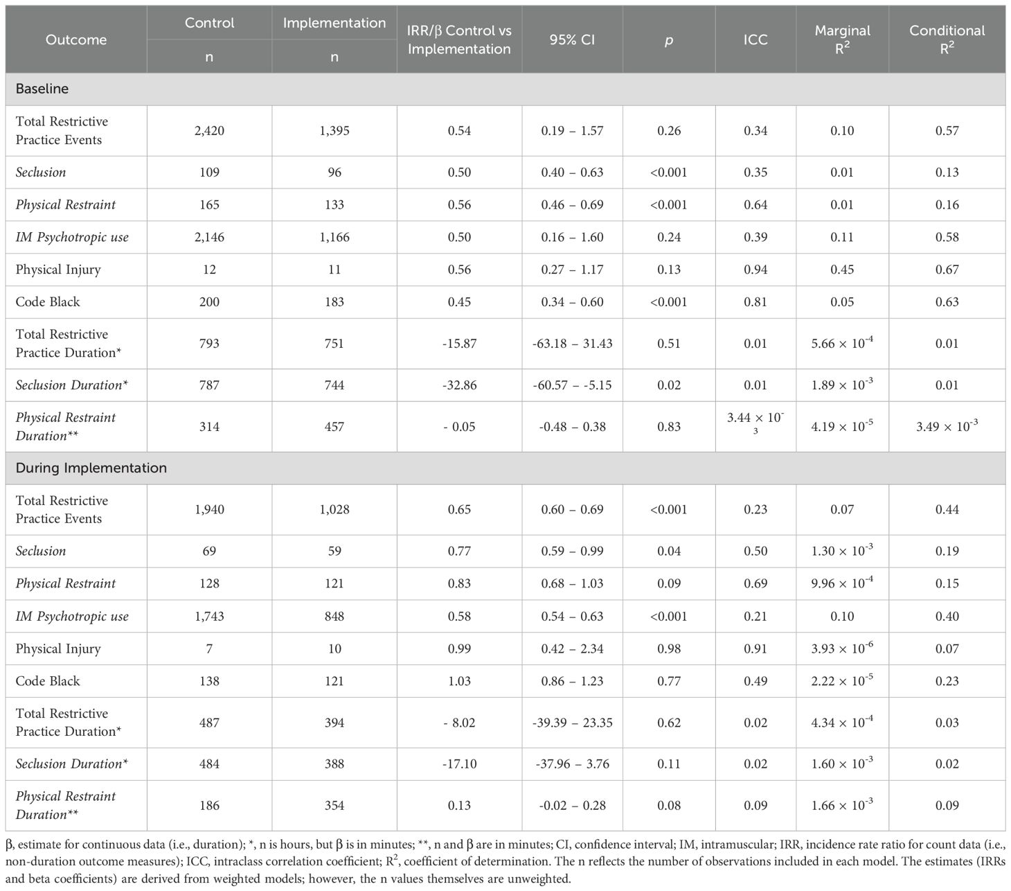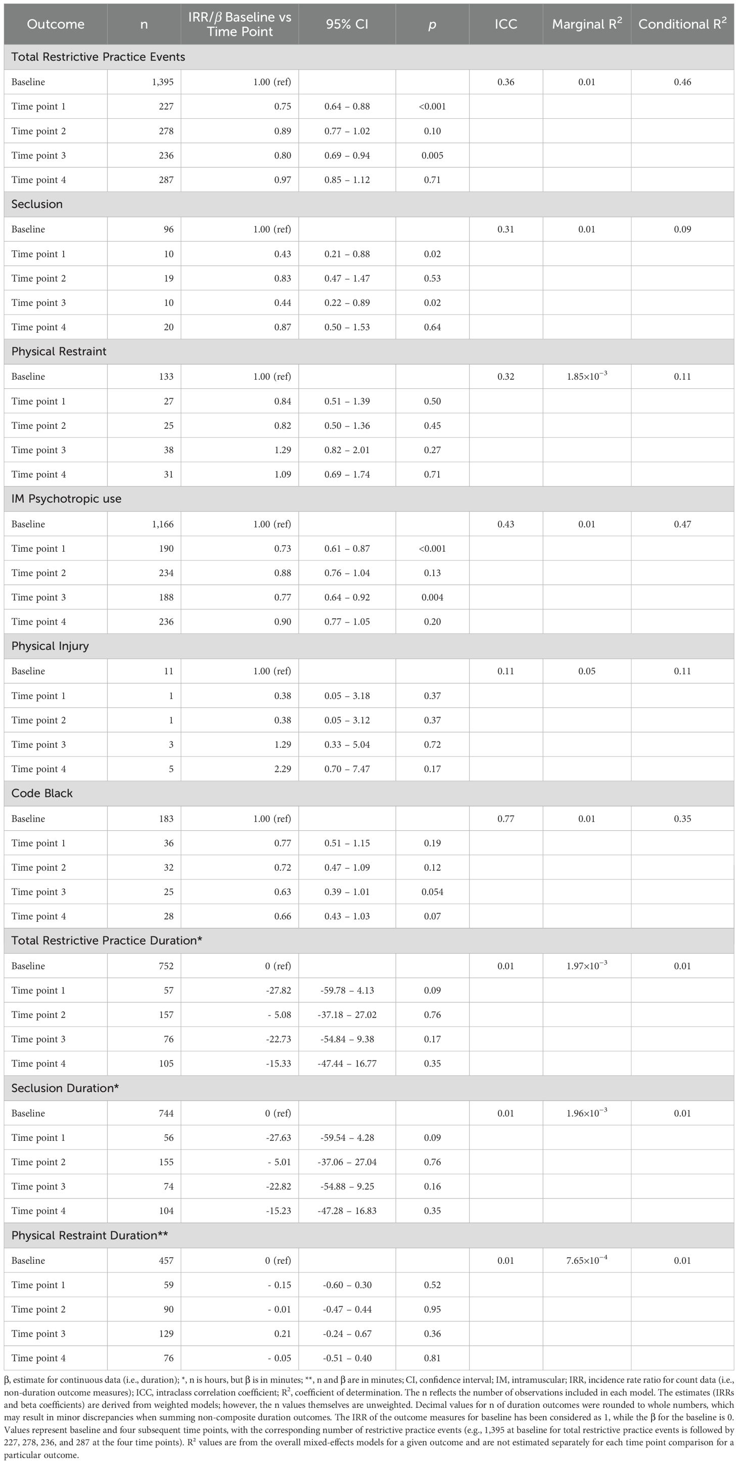 A priori generalised linear mixed models (GLMMs) were used for between- and within-group comparisons for count-based outcomes (i.e., restrictive practice events, physical injury and Code Black). In contrast, a priori linear models (LMs) were used for continuous outcomes (i.e., restrictive practice duration). Model family selection for GLMMs (i.e., Poisson, negative binomial, or zero-inflated) was informed primarily by outcome distribution characteristics, including tests for over-dispersion and the presence of excess zeros. In instances where residual normality or independence assumptions were violated in the LMs, linear mixed-effects models (LMMs) were applied. A range of a priori random effects was considered in model specification, which included the implementation unit, calendar day, month, year, and study day index. All models underwent diagnostics, including convergence checks and overall model fit indices. The coefficients of determination (R²) were calculated using the delta method (63). Parsimony and explanatory strength were considered in the final selection among competing models (see page 2 in the Supplementary Materials for the final model specifications).