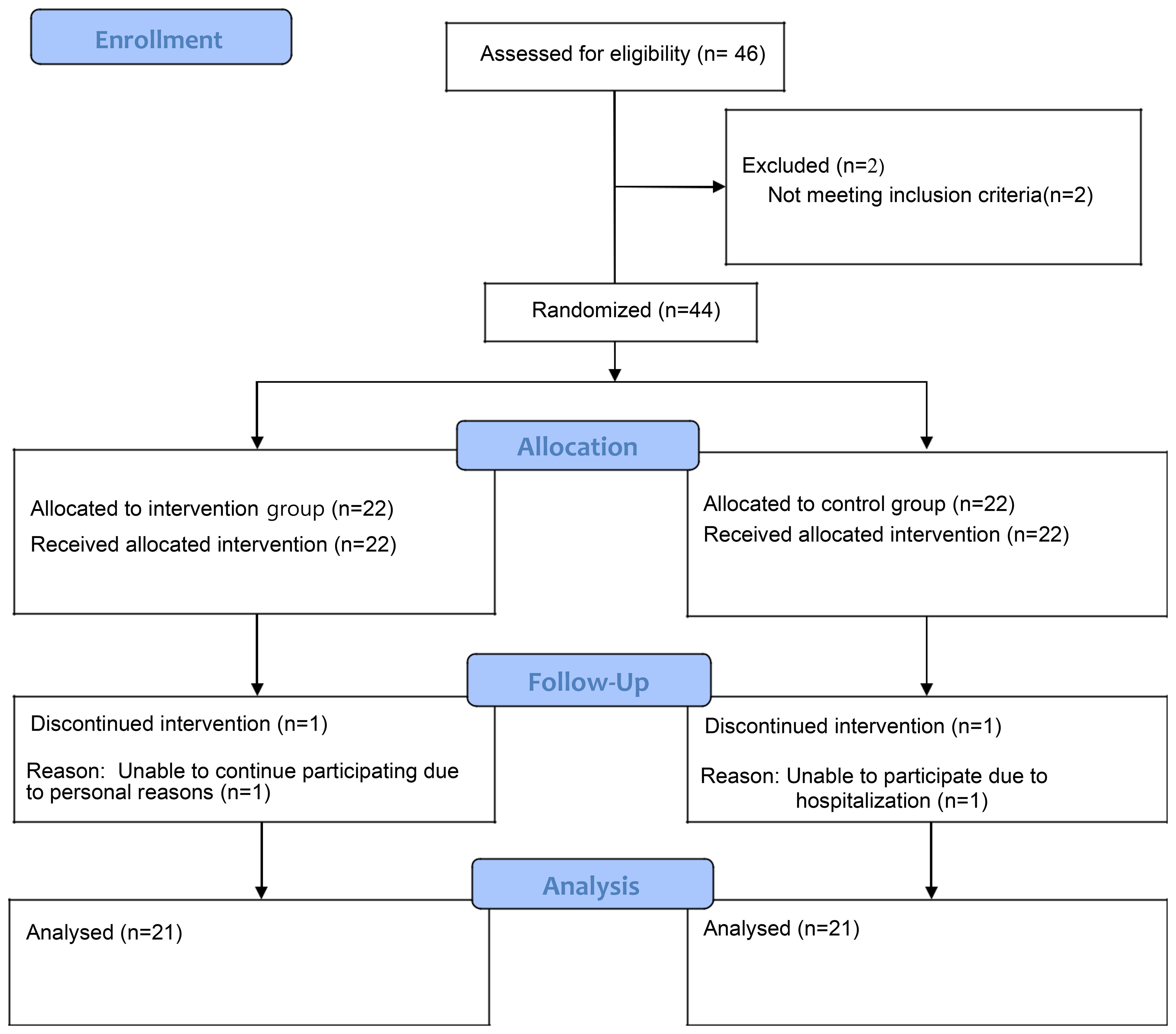 Figure 1. CONSORT flow diagram. This diagram illustrates the flow of participants through the randomized controlled trial, including recruitment, allocation, follow-up, and final analysis.