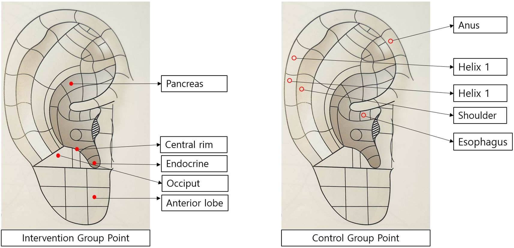 The reflex points for auricular acupressure were selected by analyzing a review of literature (8, 11, 13) and a previous study (9). The initial list was made focusing on the reflex points related to blood glucose, stress, and sleep improvement, and the final reflex points were determined after verification by one auricular acupressure expert. Through this, the validity of the reflex points to be applied to the intervention group and control group was secured. Figure 2. Auricular Acupuncture Points Used in Intervention and Sham Control Groups. Anatomical locations of the five therapeutic points used in the intervention group (marked as solid circles) (endocrine, central rim, occiput, anterior lobe, pancreas) and five non-therapeutic points used in the sham control group (marked as open circles) (shoulder, helix 1-2, esophagus, anus).Regarding the selected reflex points, the appropriateness and accuracy of positioning were verified by an auricular acupressure specialist. According to the analysis on previous studies, the duration of applying auricular acupressure and stimulation varied from 2~8 weeks, but it was found to be effective in most studies (8, 13, 16–18). In this study, it was decided to apply auricular acupressure for eight weeks to improve blood glucose and stress levels, based on the effective intervention periods consistently identified in meta-analyses of prior research.