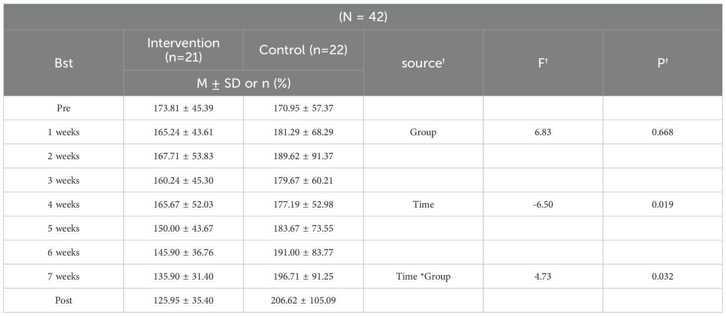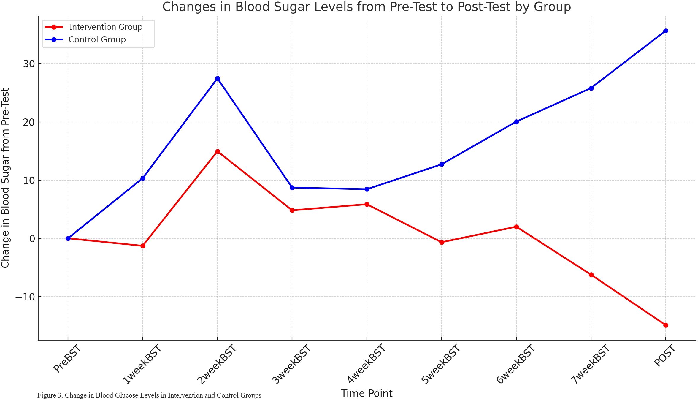 As shown in Table 4, both groups had similar baseline blood glucose levels (intervention: 173.81 ± 45.39 mg/dL vs. control: 170.95 ± 57.37 mg/dL). However, divergent patterns emerged throughout the intervention period. The intervention group demonstrated a consistent downward trend, with blood glucose levels decreasing from baseline (173.81 mg/dL) to post-intervention (125.95 ± 35.40 mg/dL), representing a substantial within-group reduction of 47.86 mg/dL. Conversely, the control group showed a progressive increase from baseline (170.95 mg/dL) to post-intervention (206.62 ± 105.09 mg/dL), indicating a deterioration of 35.67 mg/dL.