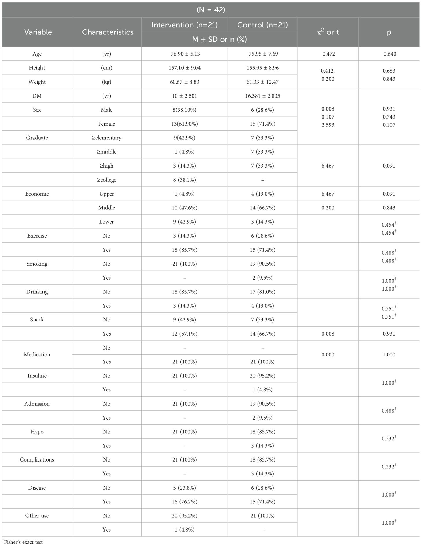 2. The prior homogeneity test on the general and health-related characteristics between the intervention group and control group was analyzed through independent t-test, Fisher’s exact test, and chi-squared test.