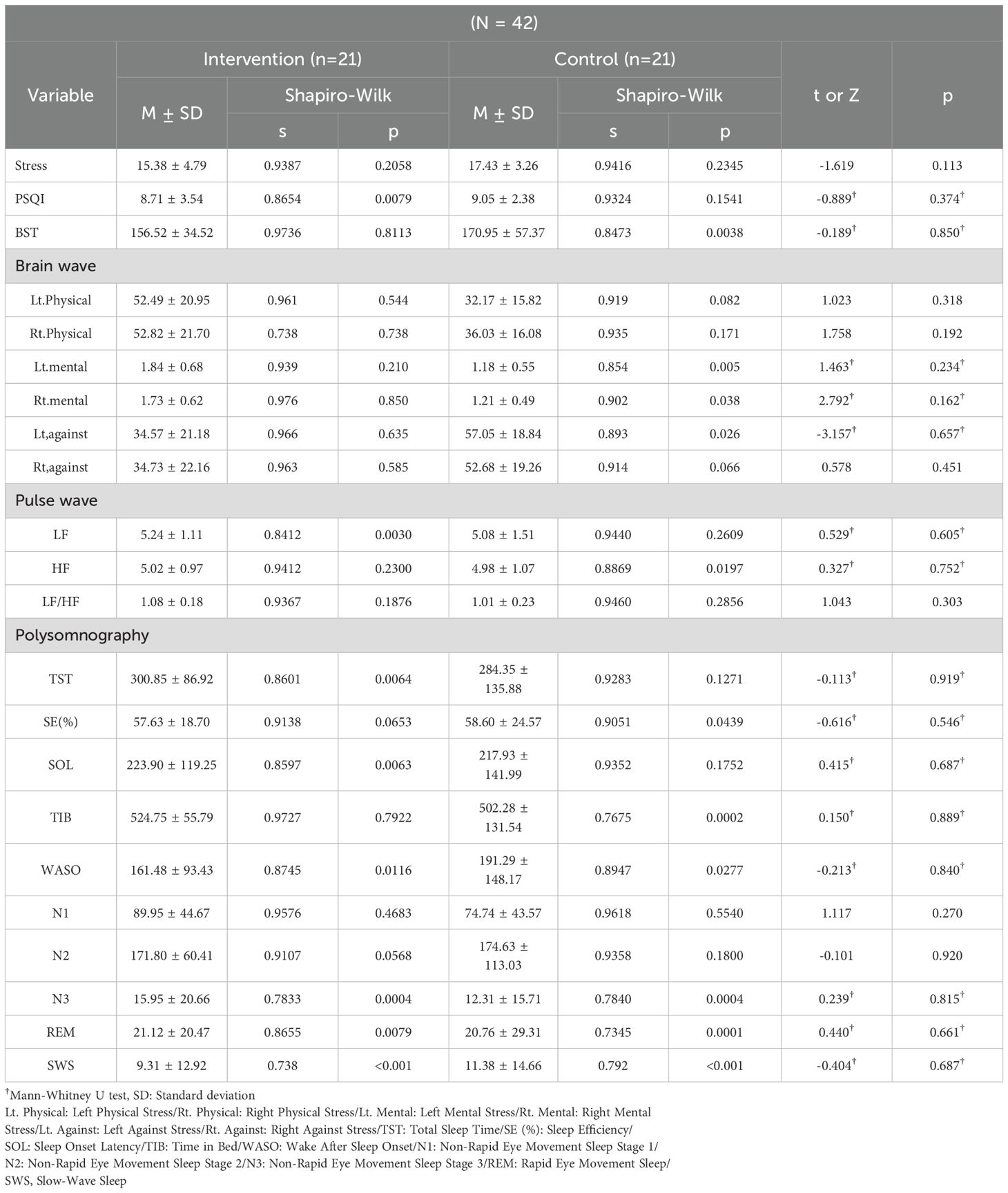 The Shapiro-Wilk test was used to test the normality of the dependent variables of the study (Table 2). The results of the test showed that some variables did not follow a normal distribution. The variables that followed the normal distribution were PSS, left/right brain physical stress index, right brain stress resistance, N1, and N2, and parametric tests were applied to them. For other variables that did not follow the normal distribution in either intervention or control group, a nonparametric test was applied.