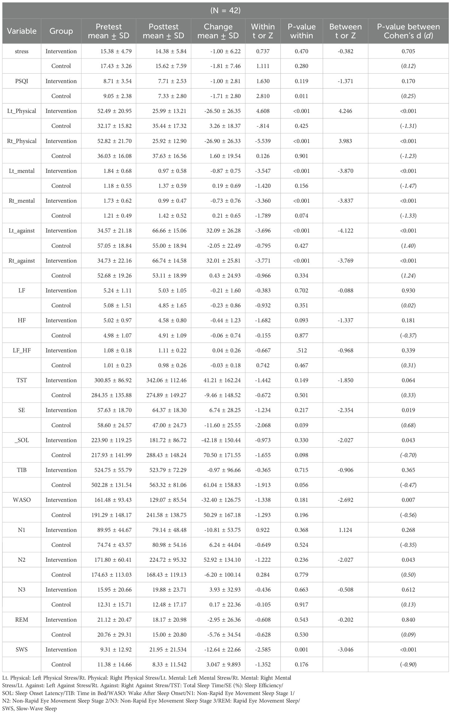 For the stress-related variables, electroencephalography (physical/mental stress, stress resistance) and the Perceived Stress Scale (PSS) were used to comprehensively evaluate the subjective experience of stress response and brain activity response. The results of the analysis are presented in Table 3.