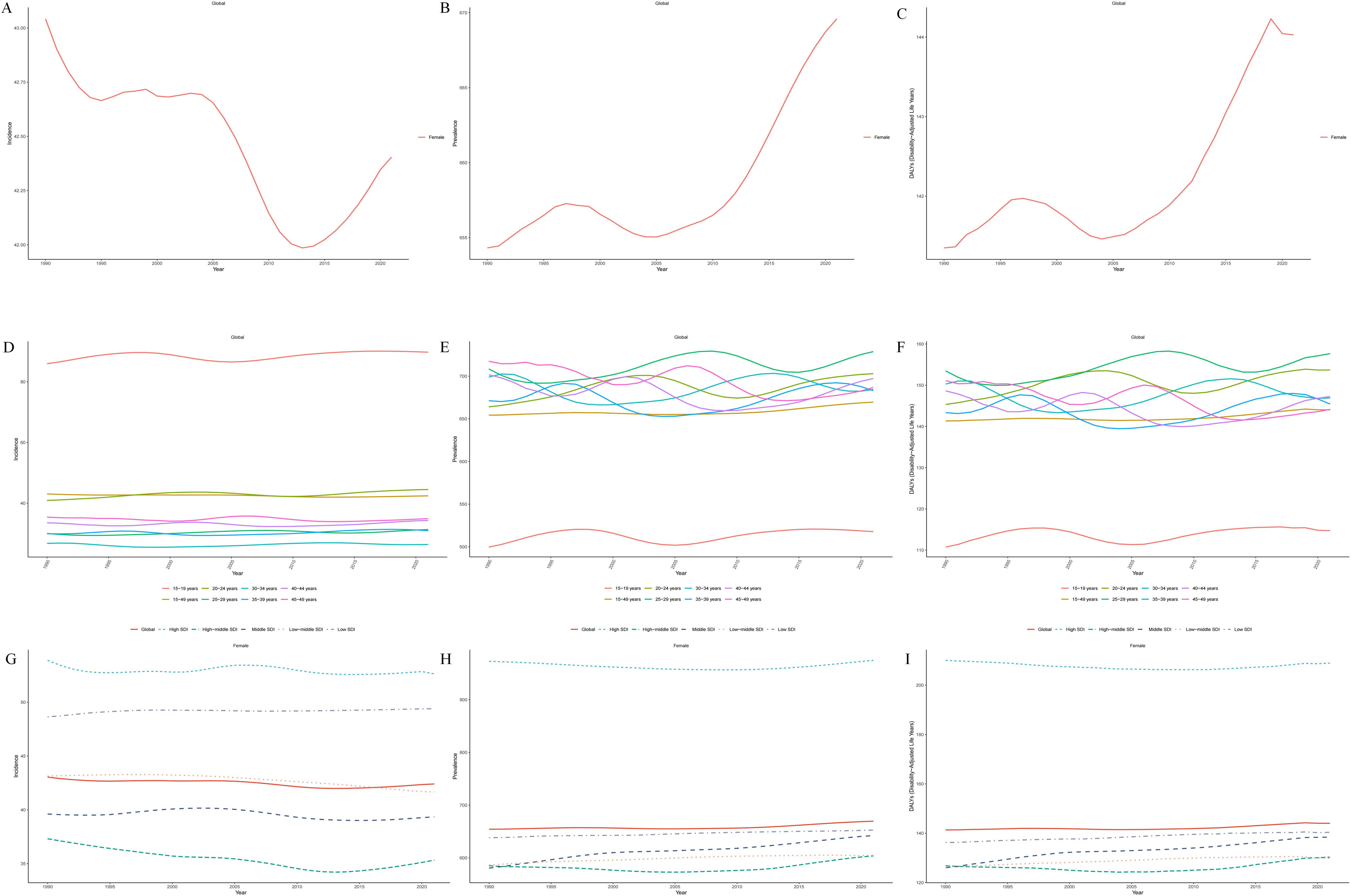 Figure 1. Global trends in the ASIR (A), ASPR (B), and ASDR (C) of BD among women of reproductive age (15–49 years) from 1990 to 2021;Trends in ASIR (D), ASPR (E), and ASDR (F) of BD among women of reproductive age by age group from 1990 to 2021;Trends in ASIR (G), ASPR (H), and ASDR (I) of BD among women of reproductive age across five SDI quintiles from 1990 to 2021.