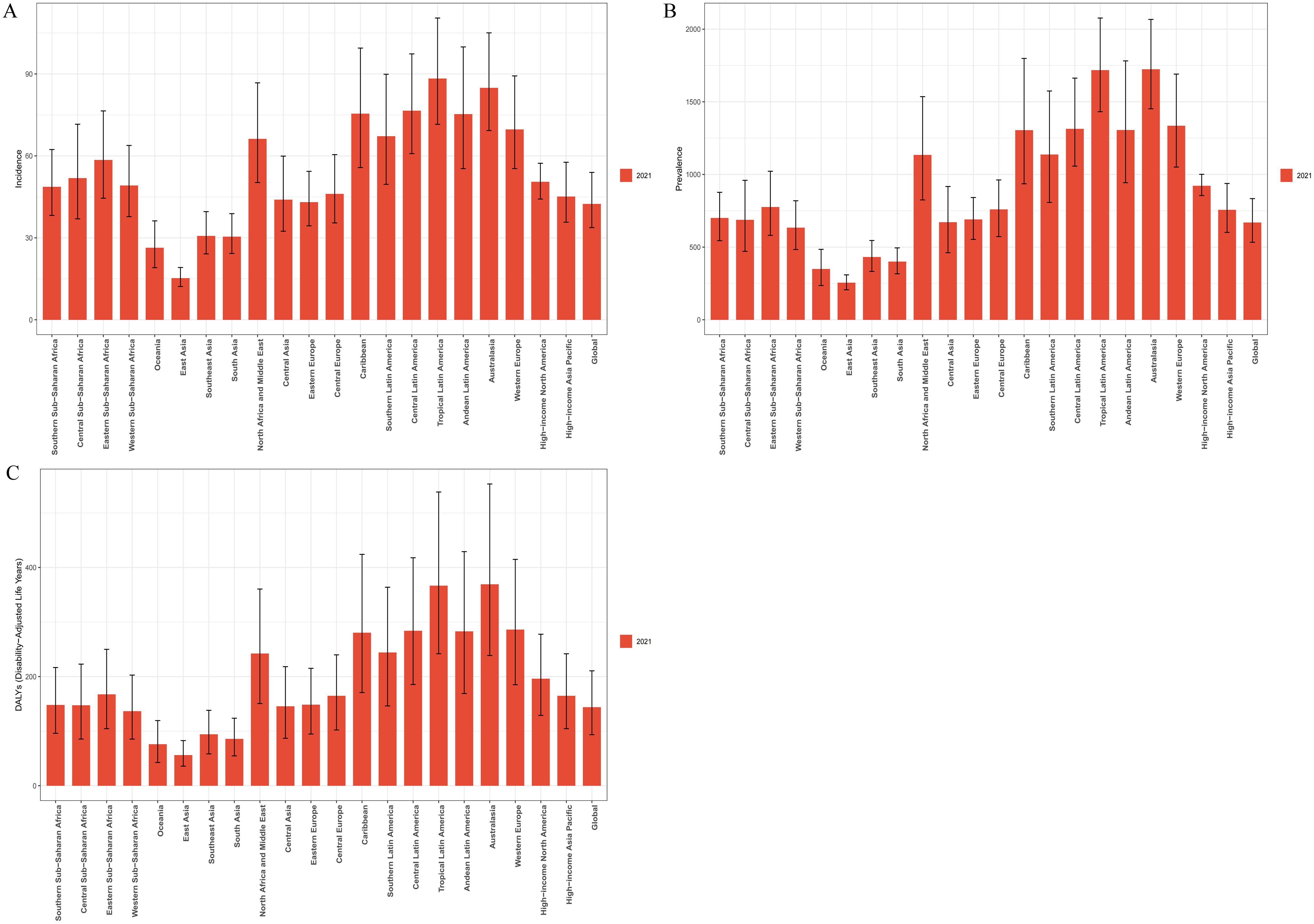 Figure 2. Regional variations in the ASIR (A), ASPR (B), and ASDR (C) of BD among women of reproductive age (15–49 years) across 21 global regions in 2021.