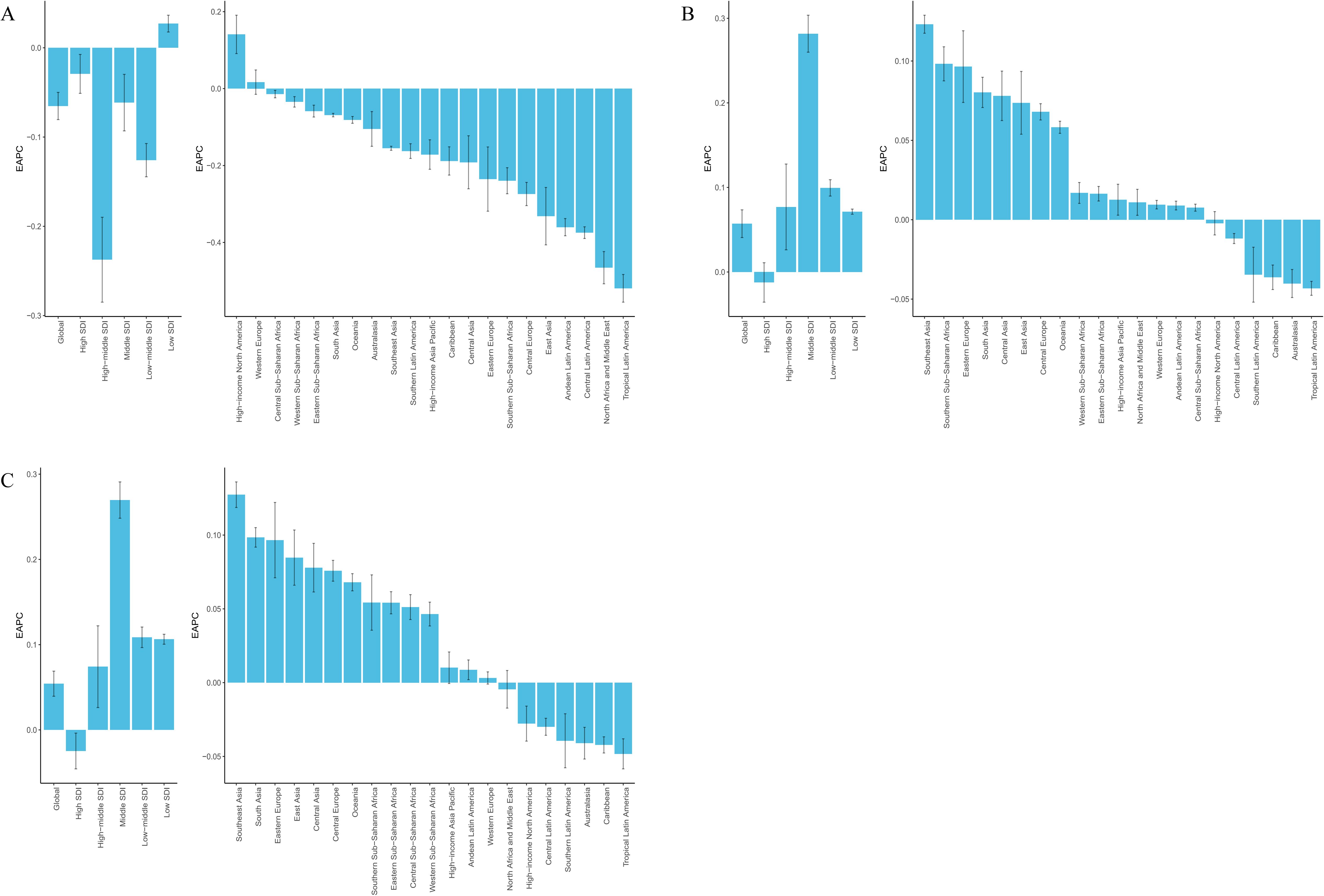 Figure 3. EAPC in age-standardized rates of BD among women of reproductive age (15–49 years) across 21 GBD regions and 5 SDI quintiles from 1990 to 2021.(A). EAPC of ASIR; (B) EAPC of ASPR; (C) EAPC of ASDR.
