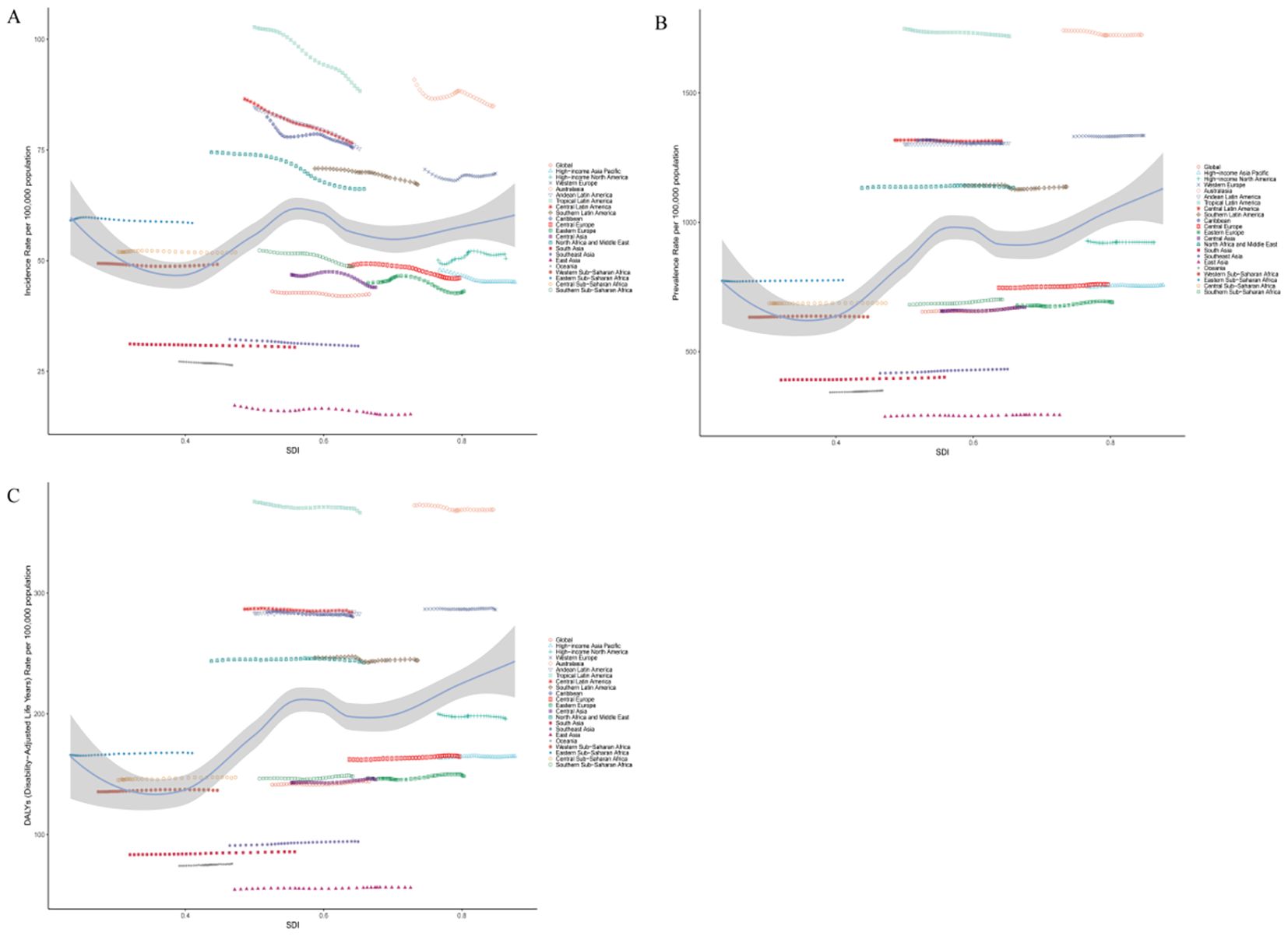 Figure 4. Associations between the SDI and the burden of BD among women of reproductive age across the 21 GBD regions: (A). Association between the ASIR of BD and SDI;(B). Association between the ASPR of BD and SDI;(C). Association between the ASDR of BD and SDI.