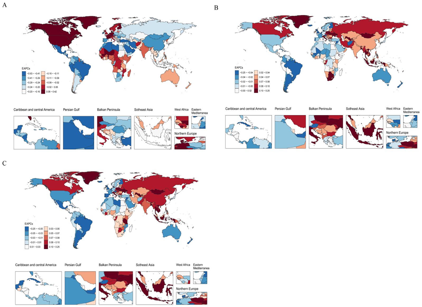 Figure 5. Distribution of the EAPC in age-standardized rates of BD among women of reproductive age (15–49 years) across 204 countries and territories from 1990 to 2021.(A). EAPC of ASIR;(B). EAPC of ASPR;(C). EAPC of ASDR.