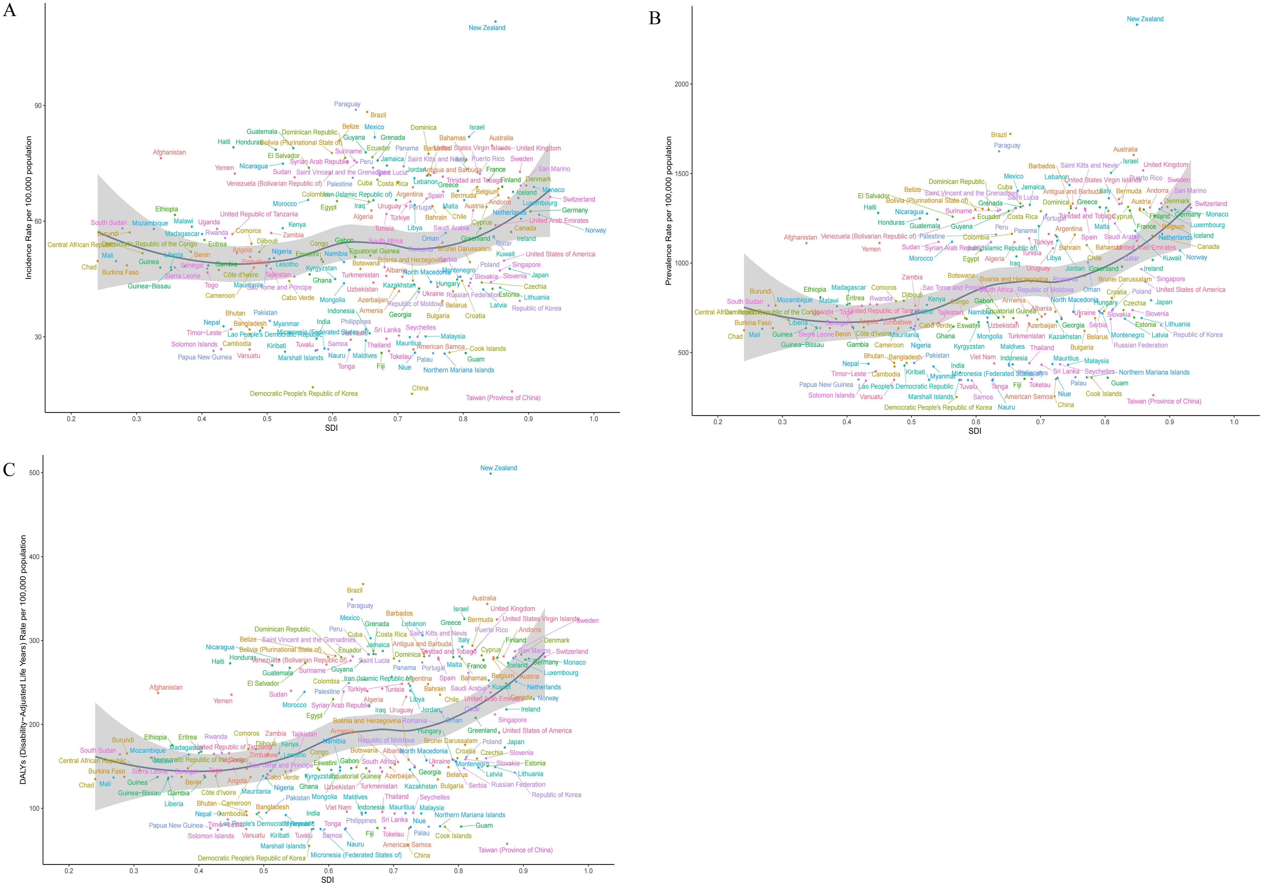 Figure 6. Associations between the SDI and the burden of BD among women of reproductive age across 204 countries and territories worldwide: (A). Association between the age-standardized incidence rate of BD and SDI;(B). Association between the age-standardized prevalence rate of BD and SDI;(C). Association between the age-standardized DALYs rate of BD and SDI.