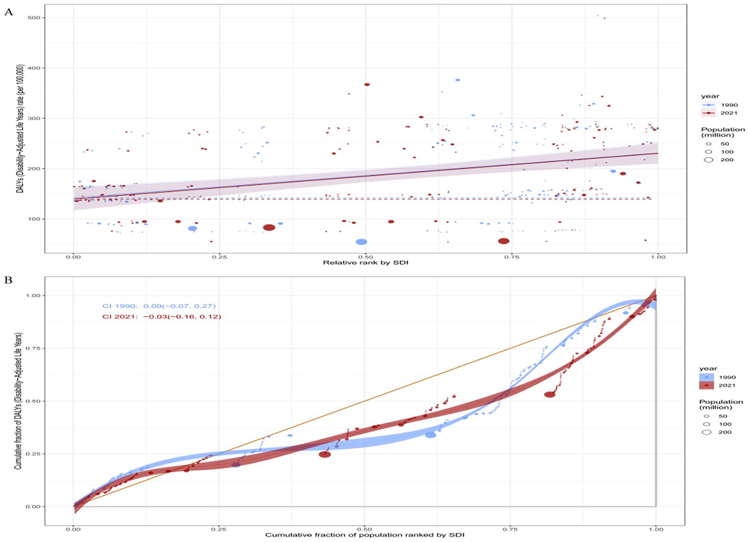 Health inequality analysis of the ASDR for bipolar disorder among women of reproductive age (15–49 years) across 204 countries revealed a persistent imbalance in disease burden across countries with different levels of socioeconomic development. According to the SII, the ASDR gap between high-SDI and low-SDI countries was 89.57 per 100,000 (95% CI: 56.71–122.44) in 1990 and slightly increased to 90.97 per 100,000 (95% CI: 60.35–121.59) in 2021, suggesting that absolute inequality related to SDI has shown little improvement over the past three decades (Figure 7A). This finding indicates that despite global efforts to expand mental health service systems, the impact on reducing disparities in disease burden across socioeconomic strata remains limited. The concentration curve lay below the line of equality, indicating that the burden of bipolar disorder was primarily concentrated in countries with higher socioeconomic status (Figure 7B). However, the CII decreased from a positive value of 0.09 in 1990 (95% CI:–0.07 to 0.27) to a negative value of –0.03 in 2021 (95% CI:–0.16 to 0.12), suggesting a possible shift of the disease burden toward countries with lower SDI over time. This trend reflects a growing convergence in mental health challenges across nations with varying development levels, highlighting the urgent need for more targeted and equity-oriented mental health intervention strategies.