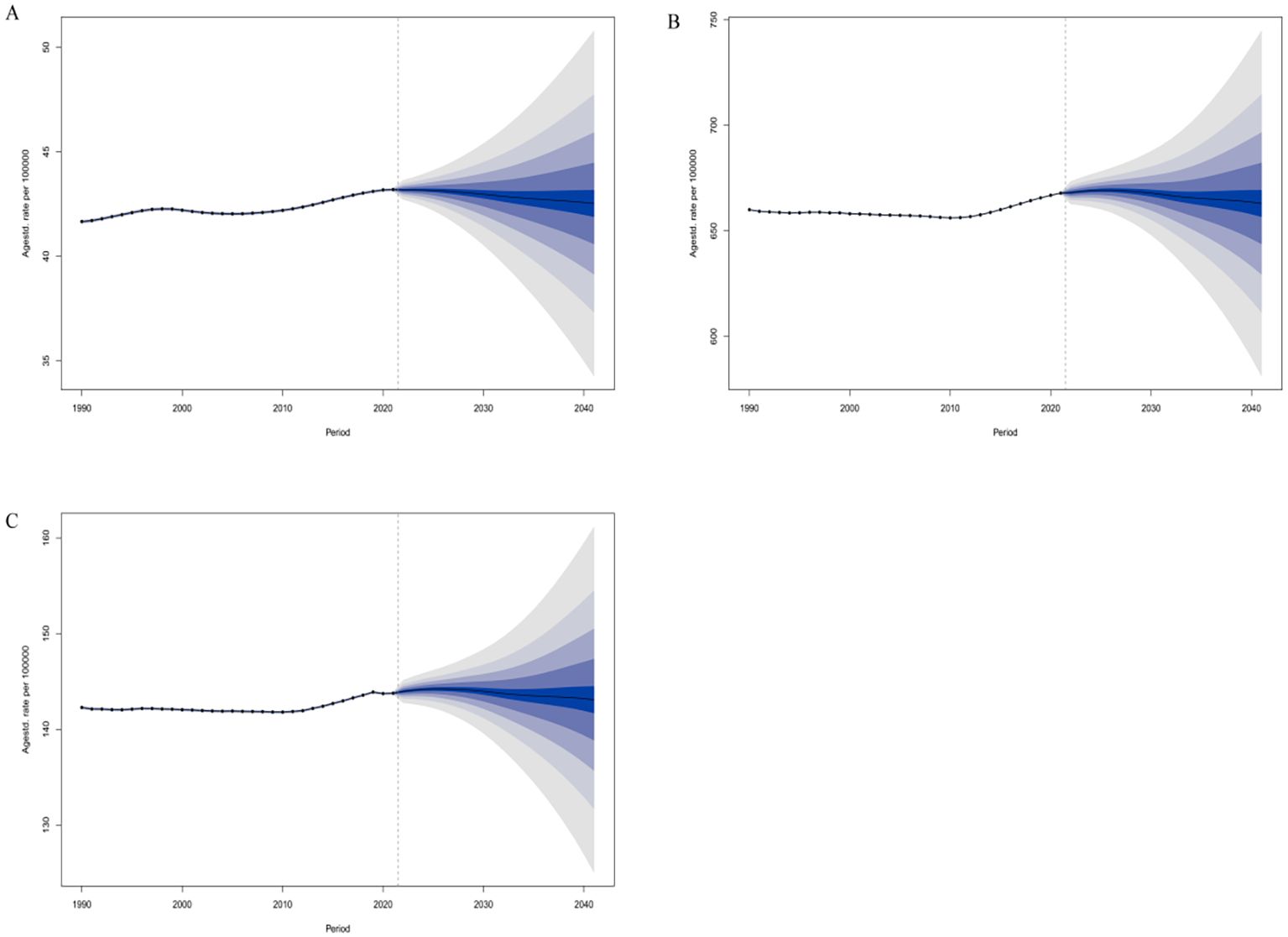 Figure 8. Predicted global changes in age-standardized rates of BD among women of reproductive age (15–49 years) by 2041:(A). ASIR; (B) ASPR;(C). ASDR.