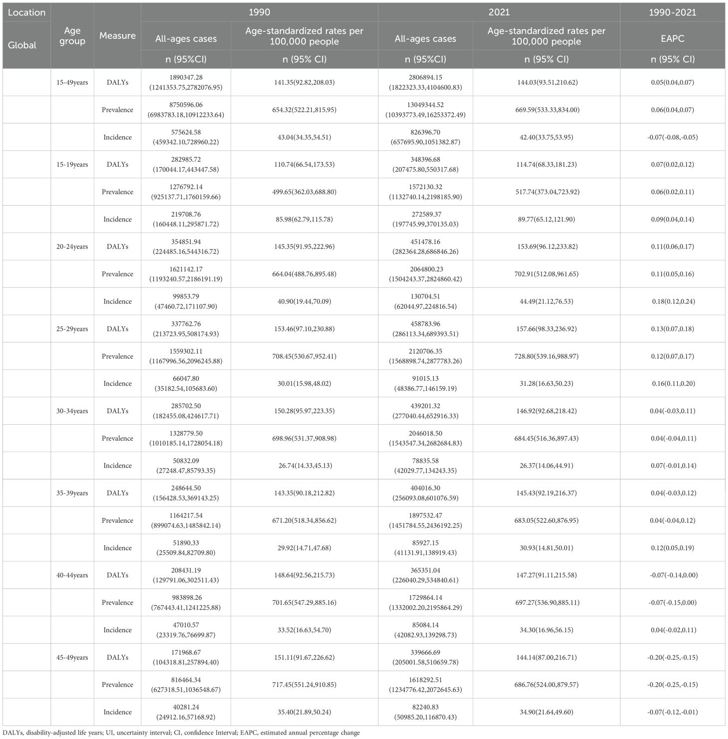 Table 1. Global incidence, prevalence, DALYs, age-standardized rates, and EAPC of BD among women of reproductive age (15–49 years) from 1990 to 2021.